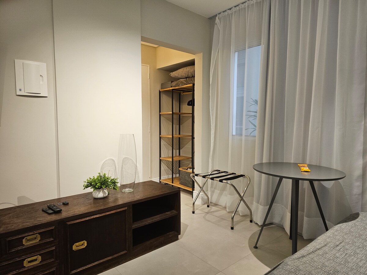 Simple Studio in downtown Campinas, WITH A GARAGE, three blocks from Cambuí.. Fjeder madras, tv, elkomfur, mikrobølgeovn, minibar, basisredskaber, tallerkener, bestik og glas, 5g Wi-Fi, loftventilator, strygejern og hårtørrer, kæledyr er velkomne. *Adgang fra 10. til 11. etage via snegletrappe som på billederne... Bygningen har to elevatorer op til 10. etage.