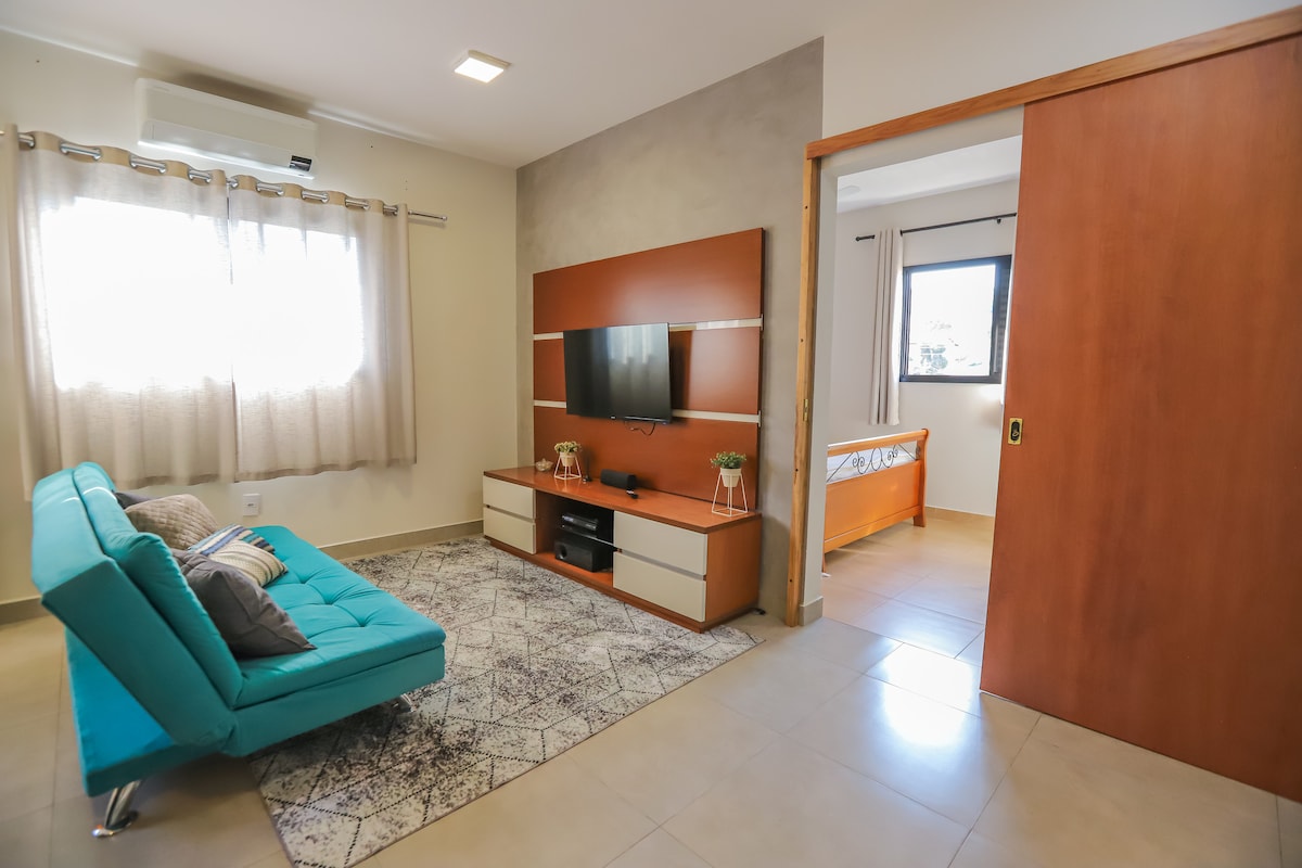 Slap af i dette rolige og stilfulde rum. Perfekt til hjemmekontor og/eller et langt ophold i byen Campinas. Rigelig plads, 60 m! Føl dig hjemme med alt, hvad du behøver for din komfort. 24-timers portner med hjælpsomme medarbejdere, der er klar til at hjælpe dig med alt, hvad du har brug for. Vores garage er stor og nem at manøvrere i, selv for SUV'er Hvis du vil nyde byen, kan du gå eller efterlade din bil i garagen, tage en Uber og undgå at betale for parkering!!!