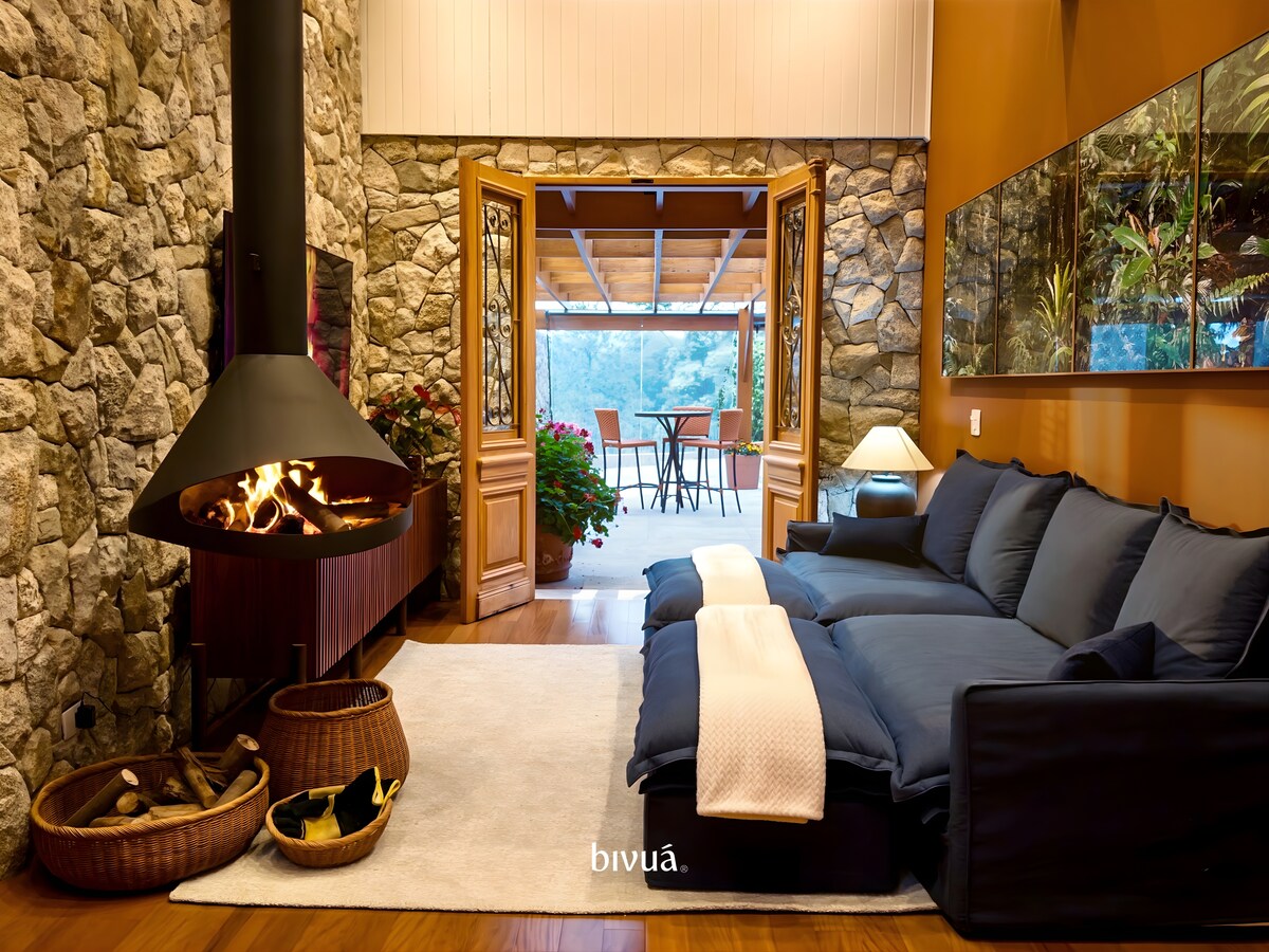 Oplev det bedste af Mantiqueira: sikkerhed, komfort og natur. Beliggende i hjertet af Mantiqueiras skov og beliggende i en privat lejlighed, er vores corten stålhus med store vinduer kendetegnet ved sin lokale kunst og håndværk. Der er plads til 10 gæster, der udvider sig til 24 med tilstødende hytter. Vi tilbyder wi-fi, kildevand, daglig rengøring og regional morgenmad. Perfekt til arrangementer, sammenkomster og feriesteder. Vi tilbyder tjenester fra massører, kokke og eksklusive smagninger