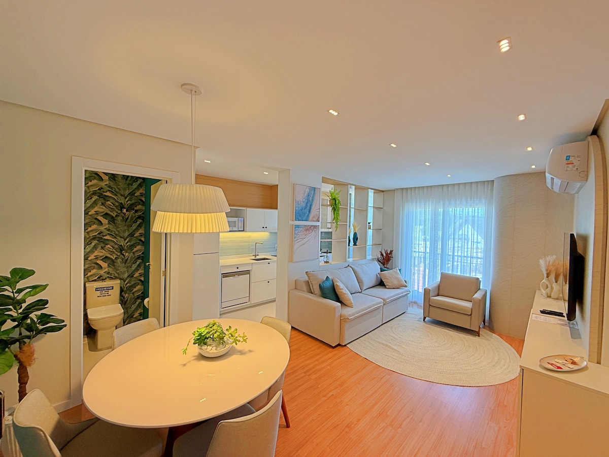 Kom og nyd vidunderlige øjeblikke. Lejligheden ligger ved siden af turistattraktionerne: pariserhjulet, Mundo A Vapor, Space Adventure (NASA Museum), Modemuseum og Havan-butikken. Den har 100 m² privat, har et komplet køkken med grill. En stor stue med pejs, varm og kold split; Smart TV med Netflix, super komfortabel sofa og balkon med udsigt over de turistiske steder (med lydisolering) og privat parkeringsplads. Perfekt til par og familier.