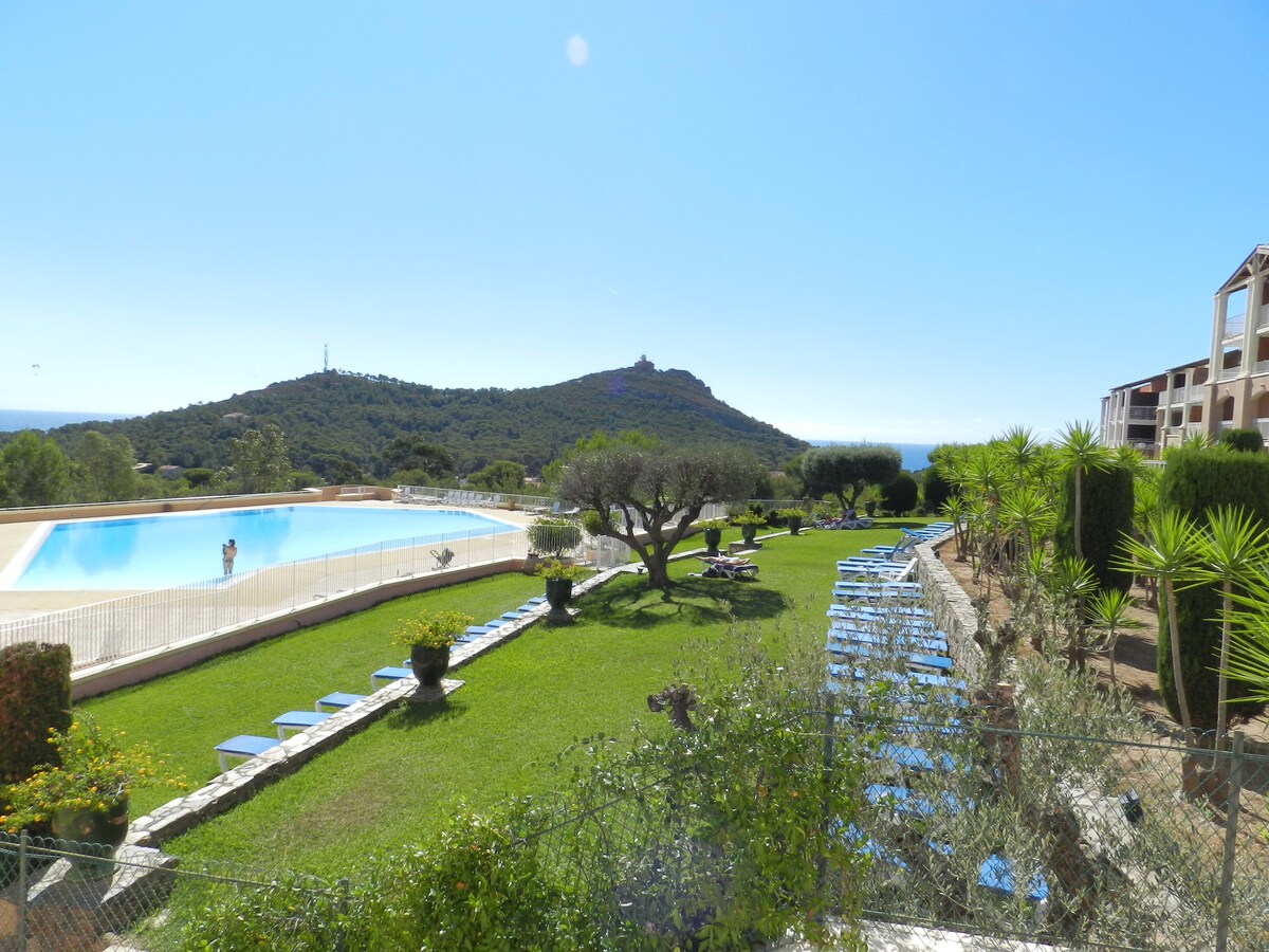 2-værelses lejlighed med terrasse med havudsigt, sydvendt, i den gågade Cap Esterel.Det ligger i et roligt område, men i gåafstand fra butikker, barer, restauranter, underholdning og swimmingpools (den ene er opvarmet fra påske til allehelgensdag).Havet ligger cirka ti minutter væk til fods eller med et lille tog om sommeren.Overdækket parkeringsplads og 5 gratis adgangskort til poolen. Der er sengetøj og håndklæder. Fiber wi-fi. Pris: -15% ved ophold på 5 dage, indtil 15. juni