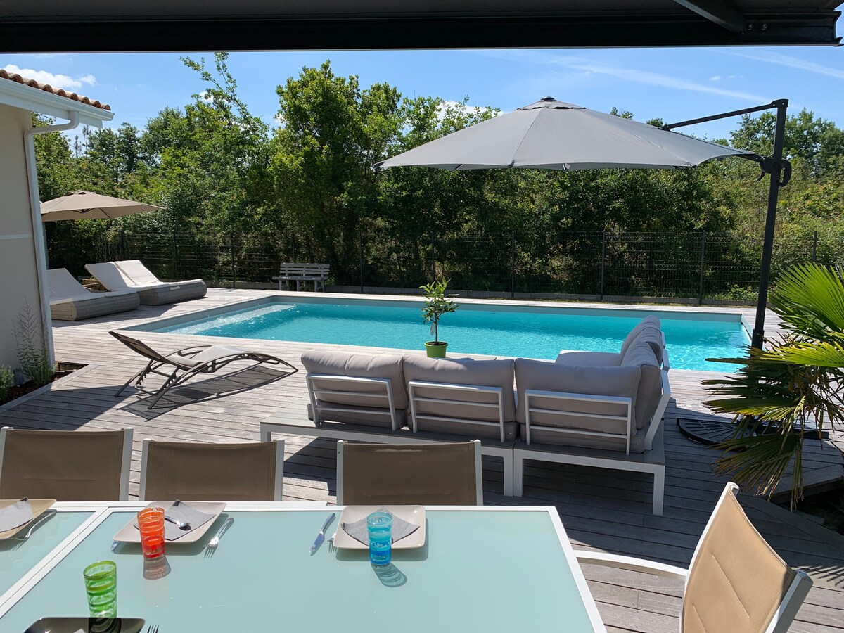 Arkitektvilla med 10 senge, aircondition. Beliggende mindre end 5 minutters gang fra de lokale butikker og strande i Bassin d'Arcachon (landsbyen Grand Piquey). bil nødvendig for at komme til havstrandene på 5 minutter (15 minutter fra centrum af Cap Ferret) Opvarmet 15 m opvarmet swimmingpool fra 15. maj til 15. september afhængigt af vejr- og vejrforhold (før og efter denne periode er den overvintret og/eller overdækket) en ægte kokon af grønne områder