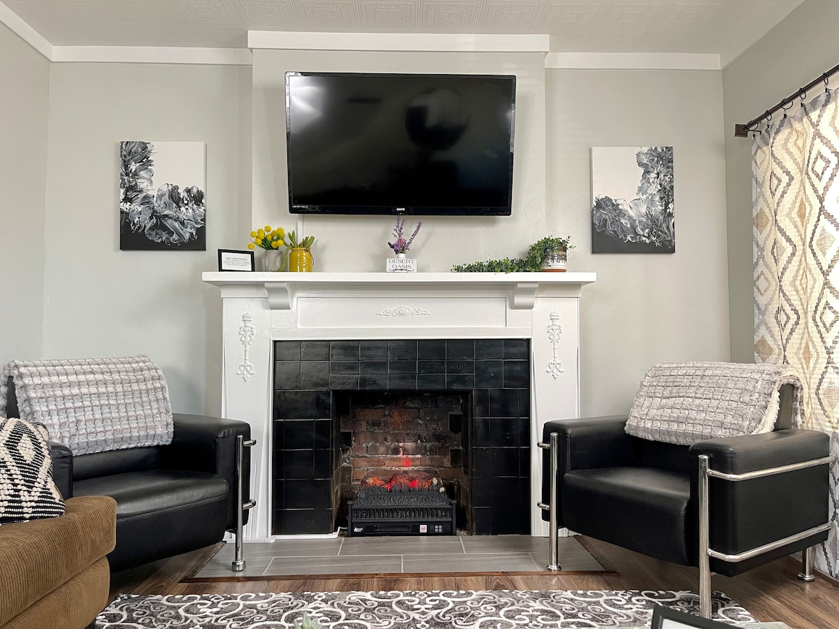 - Kæledyr er velkomne efter oplysning om race/type for 25 USD. – Der opkræves 20 dollars for hvert ekstra kæledyr separat via løsningssiden. - Smuk forhave med bjergudsigt og charmerende terrasse - Hyggeligt opholdsområde - 2 soveværelser med queensize-senge - Badeværelse med brusekabine - Fuldt udstyret køkken - Gratis WiFi - Tre smart-tv'er - Indhegnet baghave, gasgrill, bålplads og siddepladser - Gratis parkering på stedet - Opladningsstik til elbiler, adapter kan være påkrævet (10 $ per dag) - Vaskemaskine og tørretumbler - Børn er velkomne!