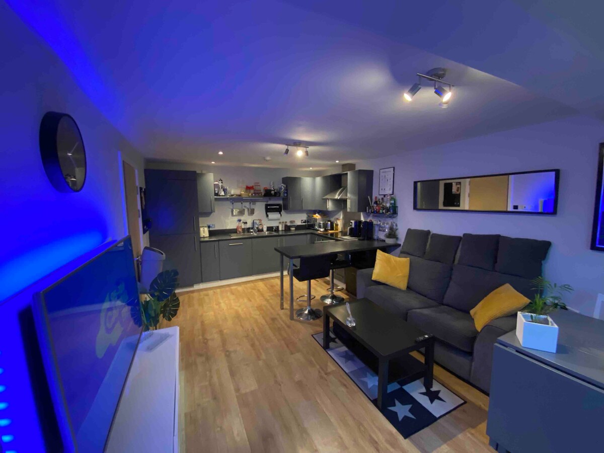 Luksuriøs rummelig lejlighed med et soveværelse i førsteklasses beliggenhed 10 minutters gang fra Cardiff centrum og 5 minutters gang til Cardiff Bay med gratis privat parkering. Den har alle faciliteter, herunder fuldt udstyret køkken, tv, stor stue med enkel sovesofa og soveværelse med kingsize-seng plus privat badeværelse med badekar/bruser. Alle toiletartikler leveres sammen med te/kaffe/vand og kiks. Tony, ejeren, mødes med dig ved ankomsten med nøgler. Bemærk, at fester ikke er tilladt.