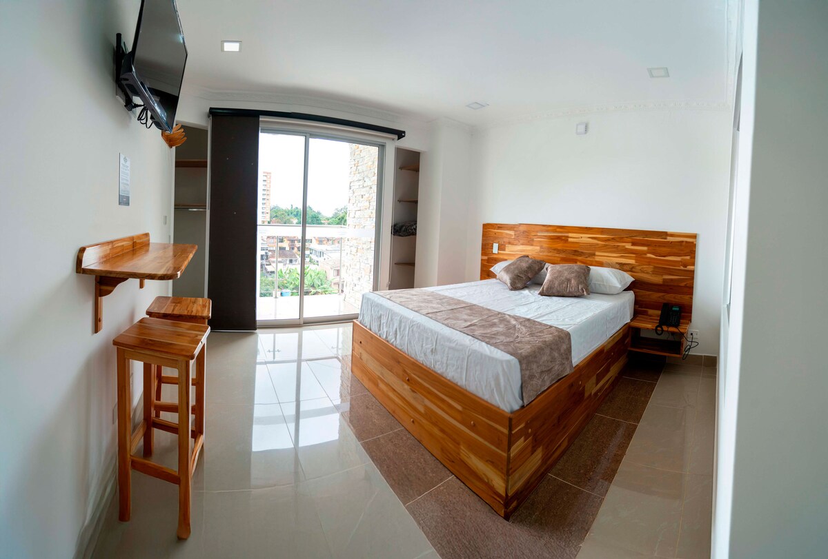 Vores Estelar Suite-værelse er designet til at tilbyde dig eksklusivitet, sikkerhed, komfort og luksus. Indretningen er original og ledsages af et sæt fine detaljer;den har minibar, LED-tv,pejs og jacuzzi. På vores hotel har vi arbejdsplads, læsesal, tagterrasse, 24 timers kaffe,morgenmad inkluderet og gratis parkering til kunderne