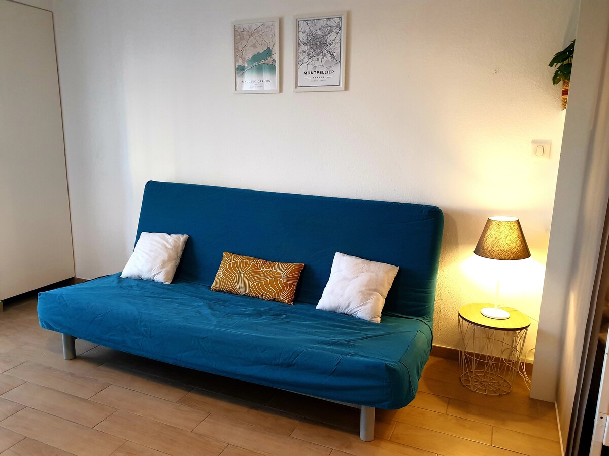 Dejlig hyttestudie, fuldstændig renoveret, beliggende på første sal i en rolig bolig med elevator og privat parkering ved foden af bygningen. Tæt på strand, expo park, Arena, lufthavn, sporvogn til Montpellier... Mulighed for 4 senge: en helt ny sovesofa (rapido) for stor komfort og en køjeseng. Perfekt til en lille familie. Fantastisk beliggenhed, tæt på strande og alle faciliteter. Alt kan gøres til fods!