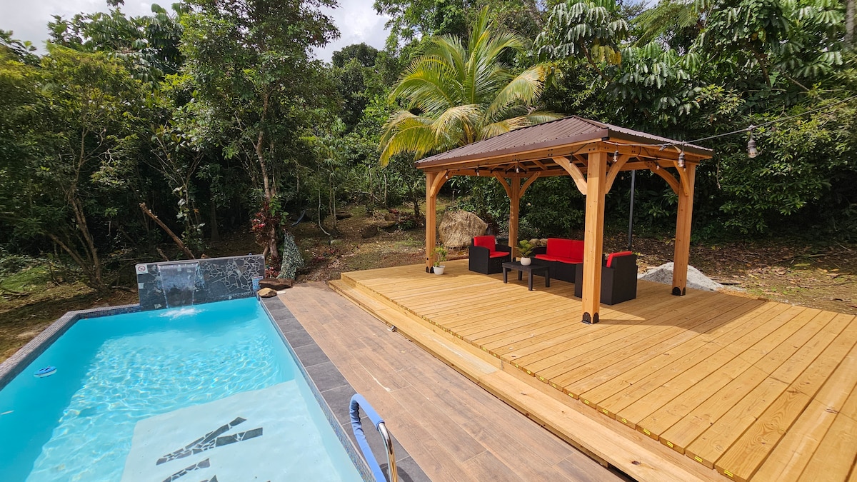 Welcome to Chalet Del Mar! A rustic luxury cabin where you will find everything you need to have an amazing unique experience. We feature a pool and jacuzzi(no hot water)where you and your family or friends can spend the whole day together. How about enjoying an evening in the light of the stars accompanied by the heat of a campfire. Trust me, the experience will be unique. Our chalet also provides you easy accesibility to beautiful beaches, even one just walking distance. The rooms feature ac
