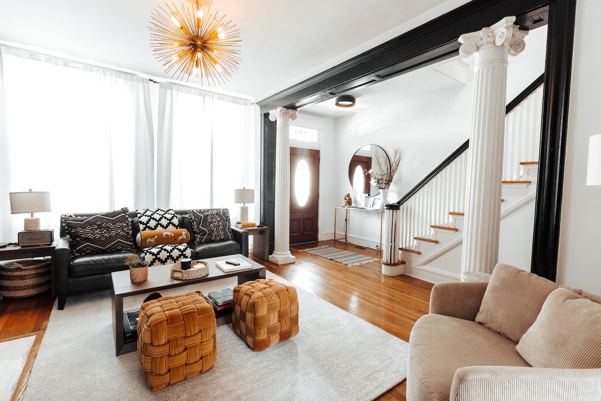 Du har fundet en sjælden enhjørning! Dette superhyggelige rækkehus er perfekt placeret blot få blokke fra VCU og en kort gåtur til Fan, Jackson Ward & downtown. Det er også mindre end 3 km fra "Richmond's Playground": Scott's Addition. Dette 540 m2 store hjem er fyldt med detaljer fra midten af århundredet, lokal kunst, bordplader i granit, rustfrie stjålne apparater og fyrretræsgulve. Der er alt, hvad du har brug for til at lave mad og vaske tøj. Du kan også parkere gratis med vores gadeparkeringskort. Vi byder dine veltrænede kæledyr velkommen!