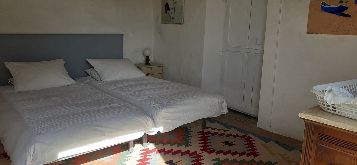 Værelse med dobbeltseng. Vinduet har udsigt over en stor mark i Alentejo, hvor solnedgangen hver dag hilser på gæsterne. Stuen er hyggelig, ideel til dem, der ønsker at læse, skrive, være alene eller have en god snak. Sofasengen kan bruges, hvis der anmodes om det. Den har en hyggelig pejs udstyret med en træfyr. Privat badeværelse.