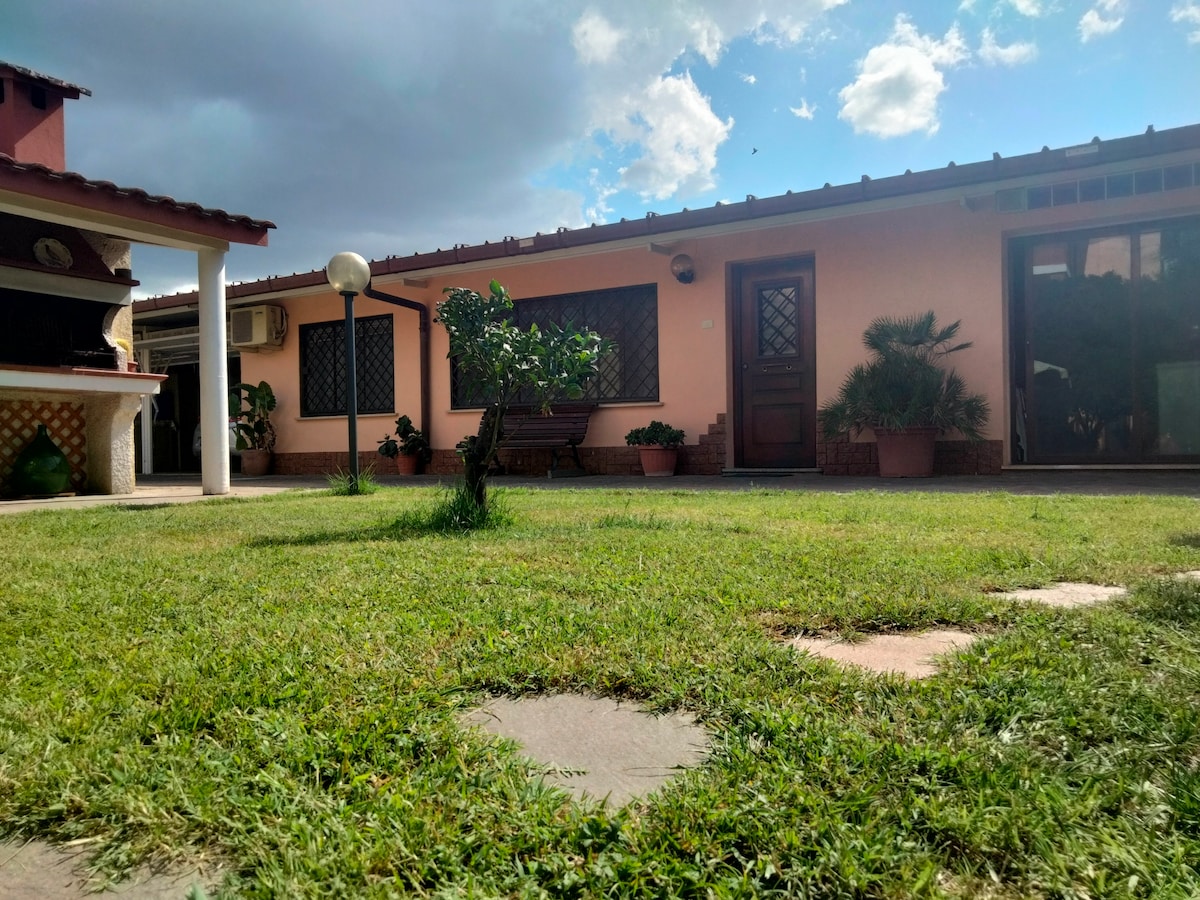 GRØNT PARADIS: 5 °C koldere end byens centrum. Toværelses halvfritstående hus i stueetagen med terrasse og have. I et sikkert og roligt nabolag elsket af udlændinge og overvåget af kameraer, kæledyrsparadis. 80 % af vores gæster kommer fra USA og Frankrig og har deres eget kæledyr med. Parkering på ejendommen. Kæmpe supermarked, dyrebutik og busstoppesteder inden for 100 m, meget tæt på Via Cristoforo Colombo: nå Rom EUR, metrostation og stranden på 10 minutter, Fiumicino lufthavn på kun 20 minutter.