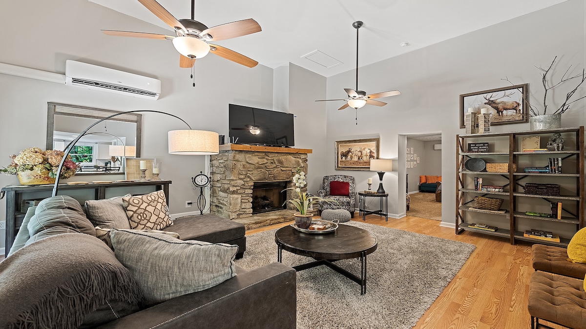 Velkommen! Dette luksuriøse trætopshus har vinduer fra gulv til loft med 360 * udsigt over NC Smoky Mountains. Den fantastiske åbne planløsning har et stort, fuldt udstyret køkken, hvor du kan hænge ud og slappe af med venner og familie. Nyd solopgangen/solnedgangen fra sengen eller på den omsluttende veranda. Sid ved det udendørs ildsted med et glas vin, og del nogle historier, eller læs en bog, mens du har udsigt over bjergene. Vores hjem har airhockey/pingpong/arkadespil og karaoke. Asfalteret adgang til boligen.