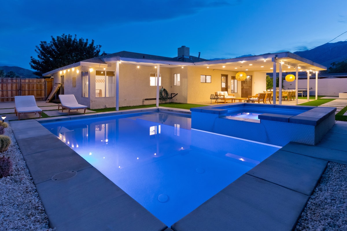 Velkommen til The Palo Verde House! Et ekstraordinært genopfundet hjem fra midten af århundredet i Palm Springs. Denne bolig er centreret omkring komfort og underholdning og har 3 kingsize-soveværelser, 3 badeværelser og indendørs/udendørs spisning. Køkkenet er fuldt udstyret, og den rummelige arbejdsstation holder dig produktiv. Omfattende baggård med smuk bjergudsigt, en funklende pool og jacuzzi. Den overdækkede terrasse er fantastisk til udendørs spisning hele året. Tesla-opladning inkluderet! Tæt på Coachella & Stagecoach festivalområder.
