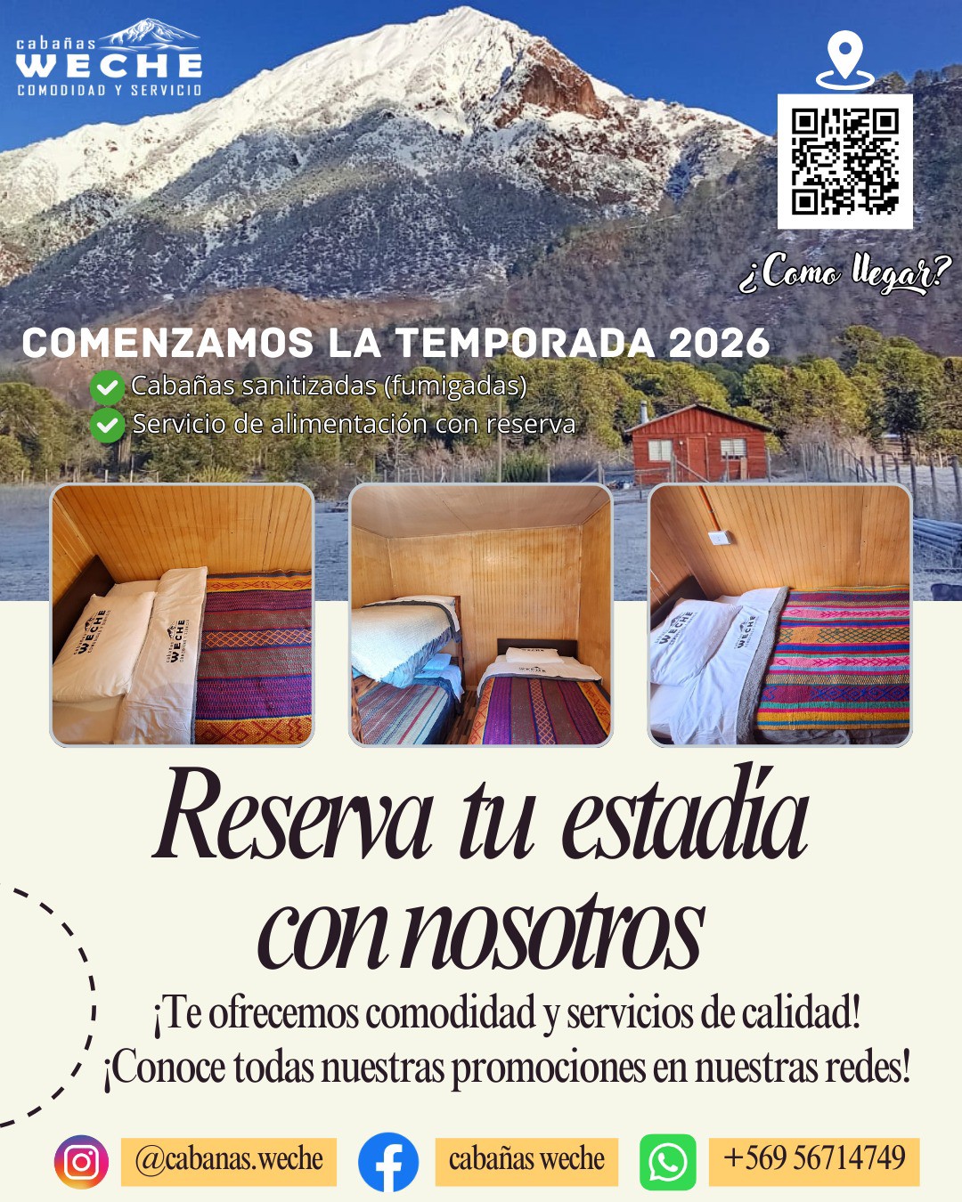 Nos encontramos a solo 7 km de la Laguna El Barco y 20 km de la Laguna La Mula, convirtiéndonos en un punto estratégico para quienes buscan explorar paisajes únicos, realizar trekking, senderismo, pesca, fotografía de naturaleza y rutas cordilleranas, o simplemente disfrutar de la tranquilidad del entorno. Las cabañas cuentan con equipamiento completo, combinando un estilo rústico que respeta la identidad de la zona con las comodidades necesarias para una estadía confortable.