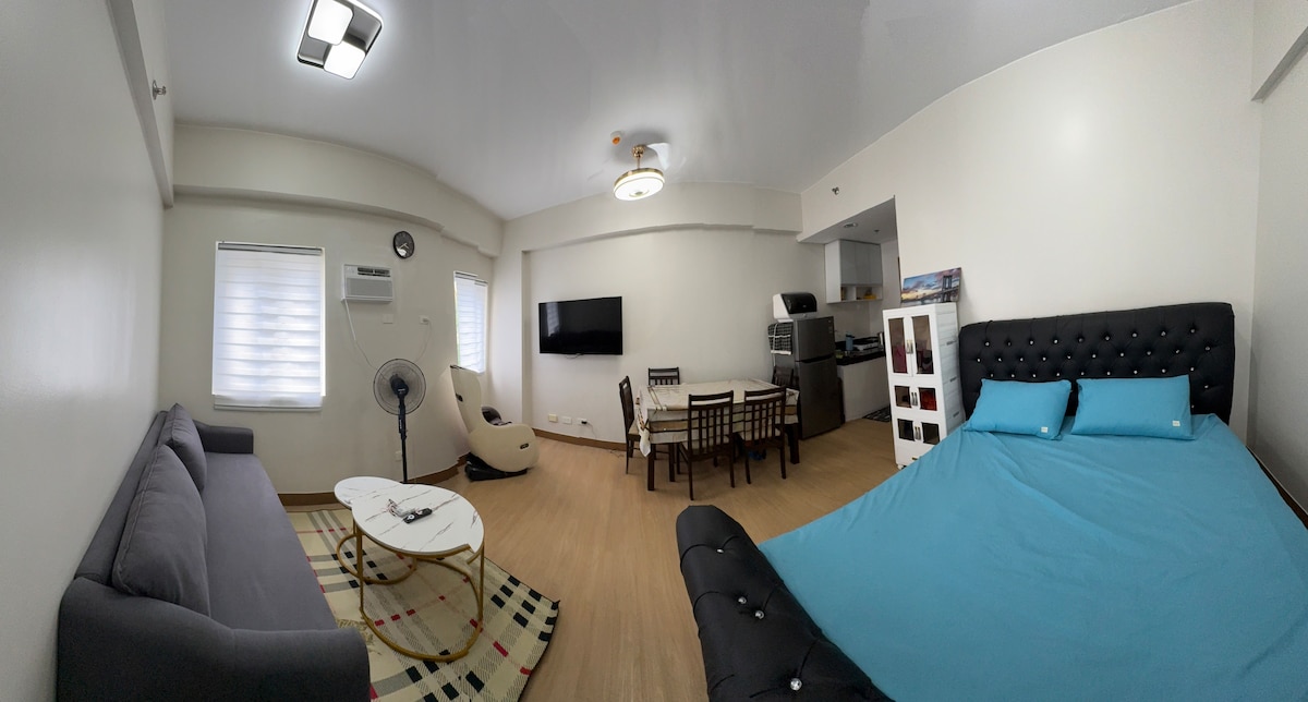 Refugio @ Tagaytay tilbyder: ✔️ 40 kvm lejlighedsenhed på Serin Tagaytay ✔️ gratis parkering i bygningen ✔️ privat soveværelse med luksus queen-seng ✔️ 200 Mbps internetforbindelse til gaming, streaming og videokonferencer ✔️ stue med komfortabel sofa og 55" smart-tv med Netflix og YouTube ✔️ badeværelse med varmt og koldt brusebad ✔️ køkken med induktionskomfur og riskoger til let madlavning adgang til✔️ offentlig pool (spørg om tilgængelighed) ✔️ elevator/lift i ✔️ nærheden af indkøbscentre, kirker, restauranter