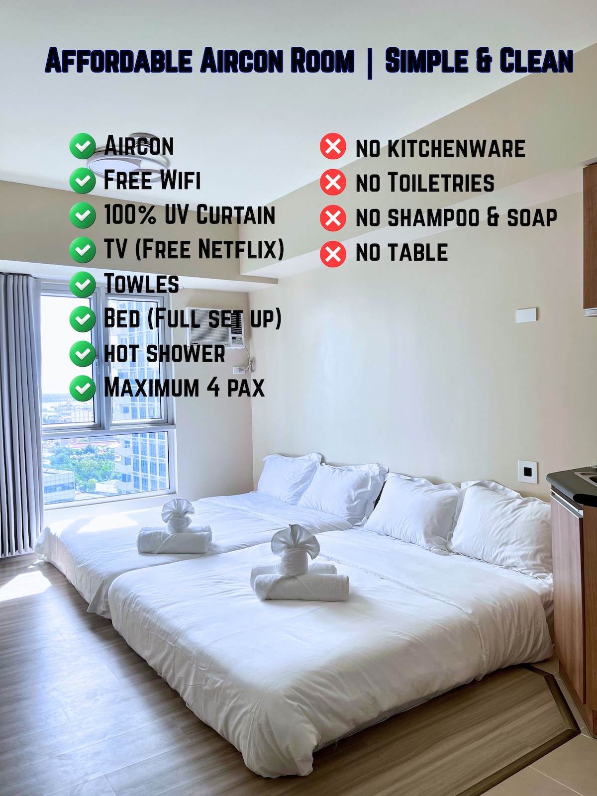 NY lejlighed i IT PARK CEBU. GODT miljø med swimmingpool, sikkerhedsplads I nærheden af berømte restauranter, casino *Gratis parkering inde i lejligheden (spørg os om tilgængelighed) *Gratis hurtigere WIFI (60MB/S), shampoo & sæbe, servietter *Persienner og mørklægningsgardiner Dette er et nyt lejlighedskompleks beliggende i Cebu IT Park. Det er en lejlighed med dobbeltseng, aircondition, tv, skab, skrivebord, køleskab, mikrobølgeovn og alt andet. Inklusive swimmingpool, sikkerhedssystem, der giver god sikkerhed, og du kan gå til Waterfront Casino, franchise restauranter, pubber, barer, banker, caféer og nærbutikker. Det er 3 minutter til fods til Ayala Central IT Park, 15 minutter til SM Mall / Ayala Cebu Mall, og 35 til 50 minutter til Mactan Airport.