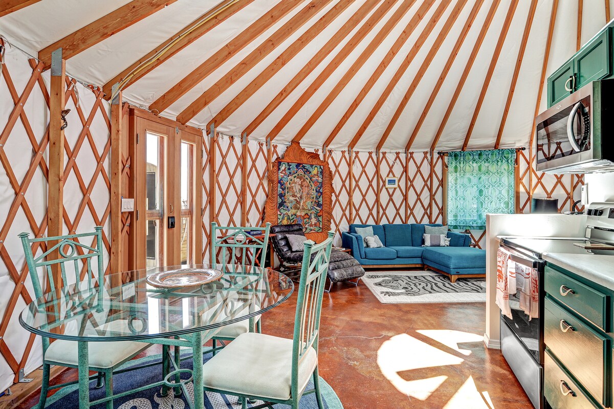 *LÆS ALLE ejendomsoplysninger, FØR DU BOOKER* Bo på det fedeste sted i Santa Fe-området. Ny terrasse! Glampingkuppel på 8 private hektar gamle kløfter, lige syd for Santa Fe på Hwy 14. Nyd 360 graders udsigt over hver bjergkæde i området - Sangre de Christos, Jemez, Sandias, Ortiz, Manzanos. Du får endda Mt. Taylor, der er sat i udsøgte solnedgange. Dette er den ultimative glampingoplevelse med høj ørken. Indendørs VVS, varme, stenbruser, kingsize-seng. Personlige kokketjenester til rådighed.