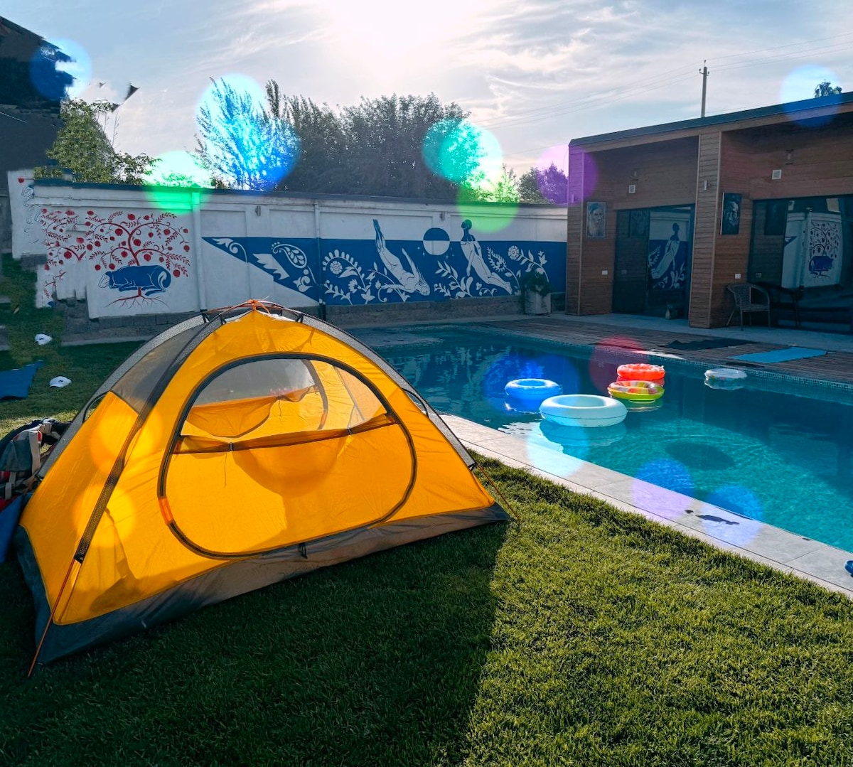 Plads til telt på græsplænen ved poolen.