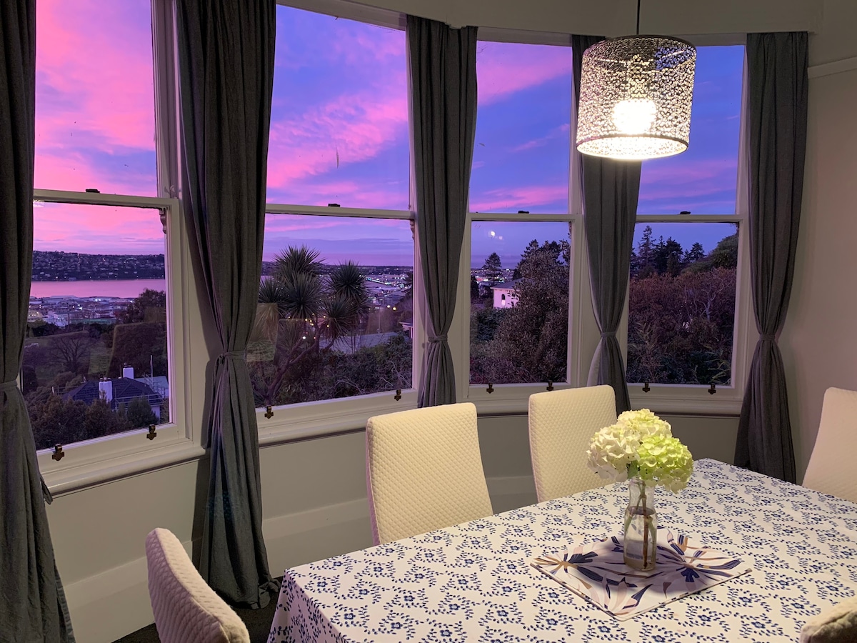 Smuk udsigt over byen og havnen, og solopgang og solnedgange En dejlig have og en terrasse med udsigt over byen, som gæsterne er velkomne til at nyde Vi byder hunde velkommen, men forhåndsgodkendelse er påkrævet. Hunde skal være stue- og socialt velopdragne. De skal have deres egen seng/bur. De medbringer eget sengetøj eller bur. Vi har en sikker, hundevenlig baggård, som vores hund, Poppy, gerne deler Kør 6 minutter til CBD eller 1 min gang til busstoppestedet 10 minutter i bil til det smukke Larnachs Castle