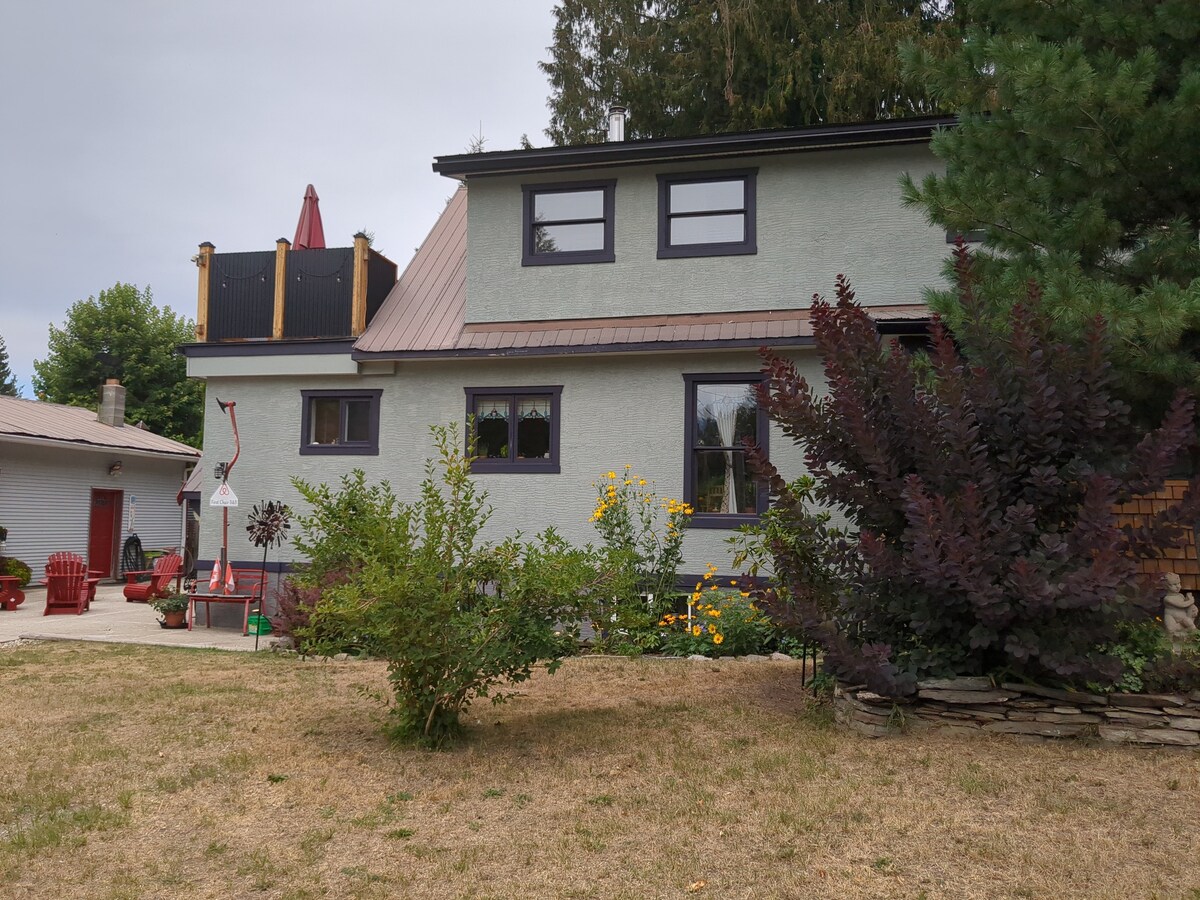 Privat, fredeligt og supersødt lille hjem i skoven, kun 5 minutter til downtown Nelson. Hyg dig i kælestolen, nyd en brændeovn og skovudsigt. Brug vores bjergkildeboblebad, eller book en brændeovnssauna (+50 dollars) og kold dyp for den ultimative Kootenay-afslapning og -opfriskning. Klatr op ad stigen til loftssoveværelset med queensize-dobbeltseng, bogsamling og fiberinternet. Udendørs pejs, komplet brusebad samt vandreture, cykling og skiløjper i nærheden. Find din lykkebolig på vores bjergferiehus
