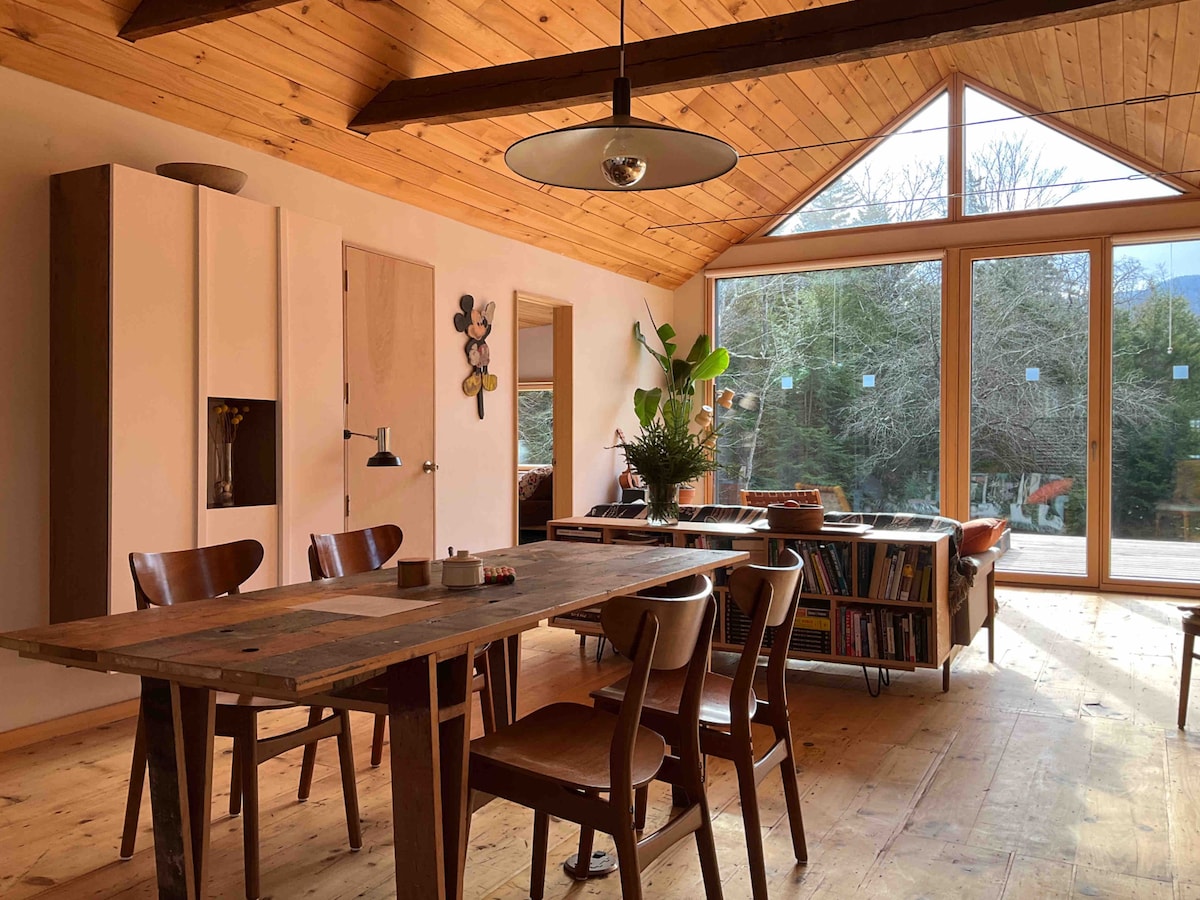 Denne luksuriøse A-rammehytte ligger i den fredfyldte skov i Saugerties i New York og tilbyder moderne komfort og naturlig skønhed. Kun 10 minutter fra Woodstock og 2 timer fra NYC, NJ. Det ligger på en privat grund på 2 hektar. Nem adgang. Med førsteklasses Casper-dobbeltsenge, en Breville-espressomaskine, en 4K-projektor, et bålsted, grill, et cedertræsfyret boblebad og sauna. Hundevenlig! En hyggelig og stilfuld feriebolig i nærheden af vandreture, skiløb og de bedste spisesteder i Catskills. Besøg vores ig 'highwoodsaframe' for mere.