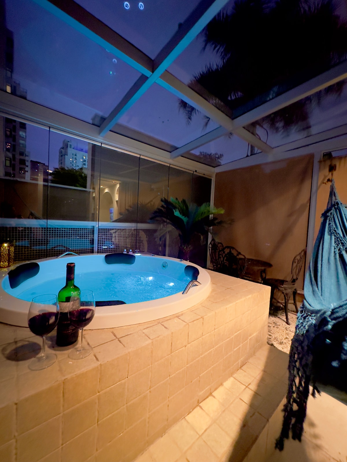 Havelejlighed med PRIVAT JACUZZI. RYGNING eller BESØG FORBUDT. Vi gør ingen undtagelser. Den har 1 soveværelse med en queensize-seng og 1 queensize-sovesofa, der kan bruges af 2 ekstra betalende gæster i reservationen. BADEKARRETS METALPUDER OG STØTTER ER KUN ILLUSTRATIVE. Vi anmoder OM BILLEDE AF hver gæsts id, der sendes i Airbnb-chatten, så snart reservationen er bekræftet, for indtjekningsprocessen. Se husreglerne for flere oplysninger.