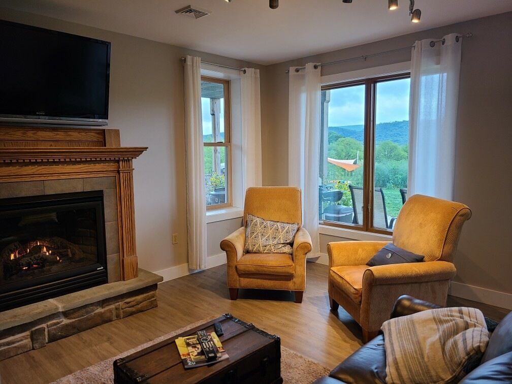 En moderne og privat suite med betagende udsigt over dalen. Enkel indretning med rene linjer vil helt sikkert få dig til at slappe af. Få en god nats søvn på blødt sengetøj, og vågn derefter en varm kop kaffe på terrassen eller verandaens gynge. Slap af i spabadet efter en lang vandretur, tag på fluefiskeri på Spring Creek i verdensklasse, der kun er kilometer væk, eller kør 8 km til Penn State for at få en kampdag. Boligen er nyrenoveret og altid forbedret. Ophold på mindst syv dage omfatter gratis professionel tøjvask.