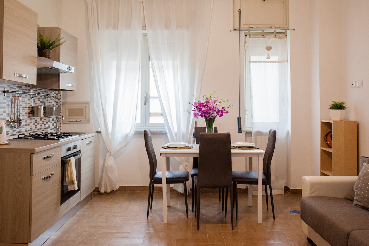 Vores hus, der er nyrenoveret med solpaneler og et topmoderne autonomt klimaanlæg, er designet til at være mere miljøvenligt og komfortabelt. Lejligheden ligger 1 km fra hovedbanegården, 3 km fra den internationale lufthavn og 1,5 km fra Napolis historiske centrum. Den har et komplet køkken, en stue med et smart-tv, hurtig wi-fi og alt, hvad du skal bruge til et afslappende ophold. Vi glæder os til at byde dig velkommen og guide dig til at opdage vores unikke by!🌿