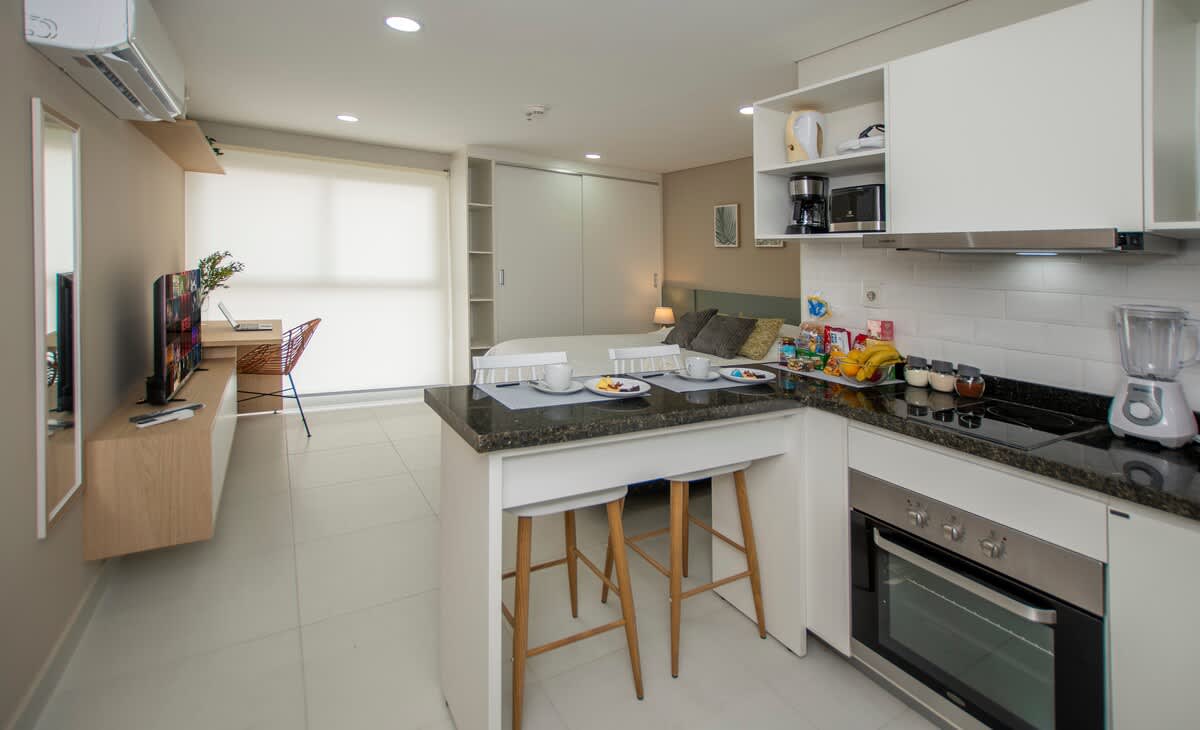 Modern studio in Los Laureles, one of Asunción’s most exclusive and safe neighborhoods. Queen bed + sofa bed for up to 3 guests. Fully equipped kitchen and air conditioning. Access to unique building amenities: pool, private cinema, BBQ area & mechanized garage with 24hs security. Dedicated workspace and high-speed WiFi — perfect for business trips or couples’ getaways. Building staff check-in, instant communication. Superhost with 20 five-star reviews.