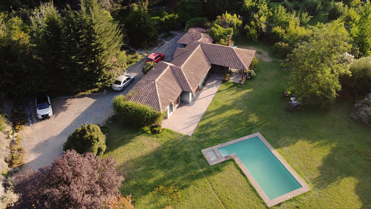 Charmerende grund med eksklusiv pool, træer og haver. Det er et komplet hus i et privat rum, der er ideelt til at slappe af, nyde familien og arbejde hjemmefra omgivet af natur. 40 minutter fra Santiago via motorvejen kan du nå denne 3 Bed, 2 Bath hjem. Et mesterværk med en-suite bad og arbejdsplads. Omgivet af lille skov, frugttræer og frugtplantage. Det er et gratis sted at se på stjernehimlen.