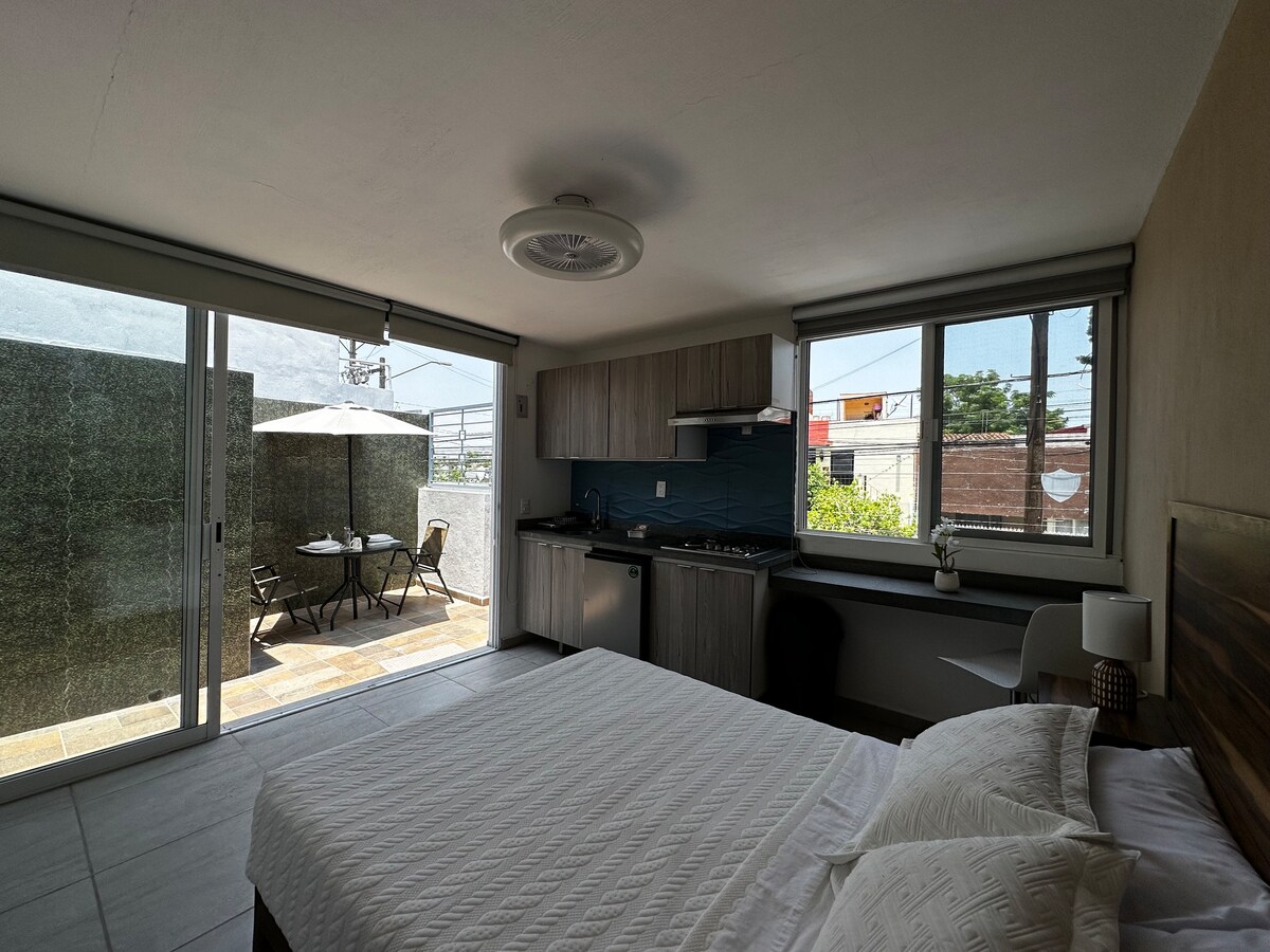 Uovertruffen beliggenhed i American Colony. Super sødt, rummeligt, lyst og charmerende. Komfortabel kingsize-seng, køkken og spisestue. Et par skridt fra Av. Chapultepec, omgivet af det bedste køkken og kulturliv i Guadalajara. Perfekt til at hvile og nyde byen med alle faciliteterne. En fælles udendørs terrasse Barer. Restauranter. Sjov og al underholdningen omkring denne perle. Vidunderlige omtaler