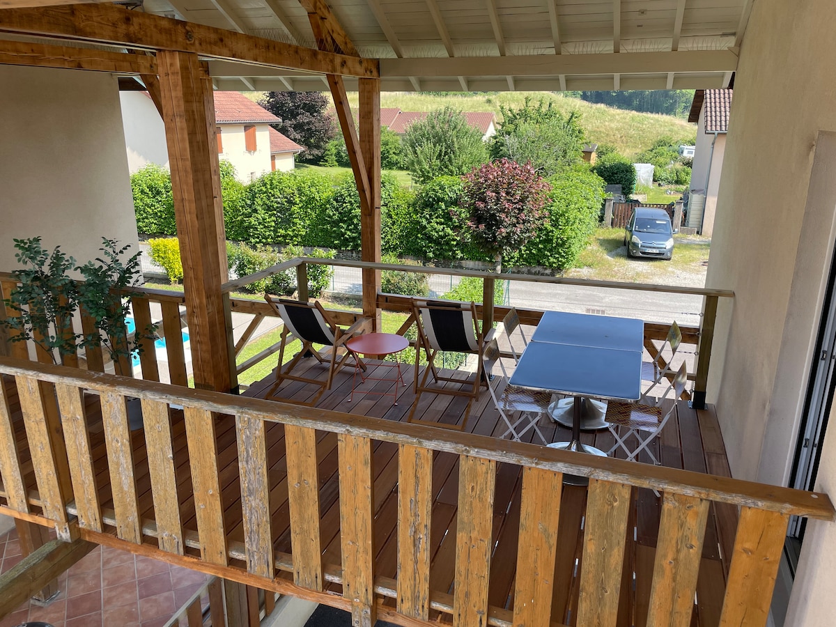 Appartement au calme proche du lac de Paladru. Idéalement situé entre le Vercors/ la chartreuse. Accès direct chemins pour ballades pied/vélo. Possibilité d'accompagnement pour vos balades. Appartement d'environ 60m² en étage avec terrasse composé d'une pièce de vie salon/salle à manger avec cuisine équipée (four/plaque/micro-onde/lave vaisselle/petit frigo), 1 chambre lit double, 1 chambren mezzanine avec 2 lits simples pouvant être jumelés + salle de jeux enfant, salle de bain et wc.