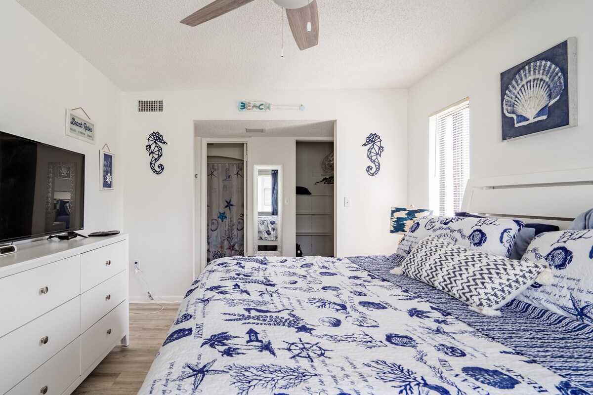Lejlighed på stranden, nyd vores ombyggede køkken og brusere, der har fuld panoramaudsigt over Den Mexicanske Golf. 1/4 af en mile til restauranter. Det store værelse har en kingsize-dobbeltseng med smart-tv . Det andet gæsteværelse har en queensize-dobbeltseng og en dobbeltseng med tv på værelset, og stuen har en udtrækssofa. Oplev fredelige solnedgange, og kom væk fra hektiske dage. Duft den salte luft fra vores rolige lanai. Vores plads er din plads.