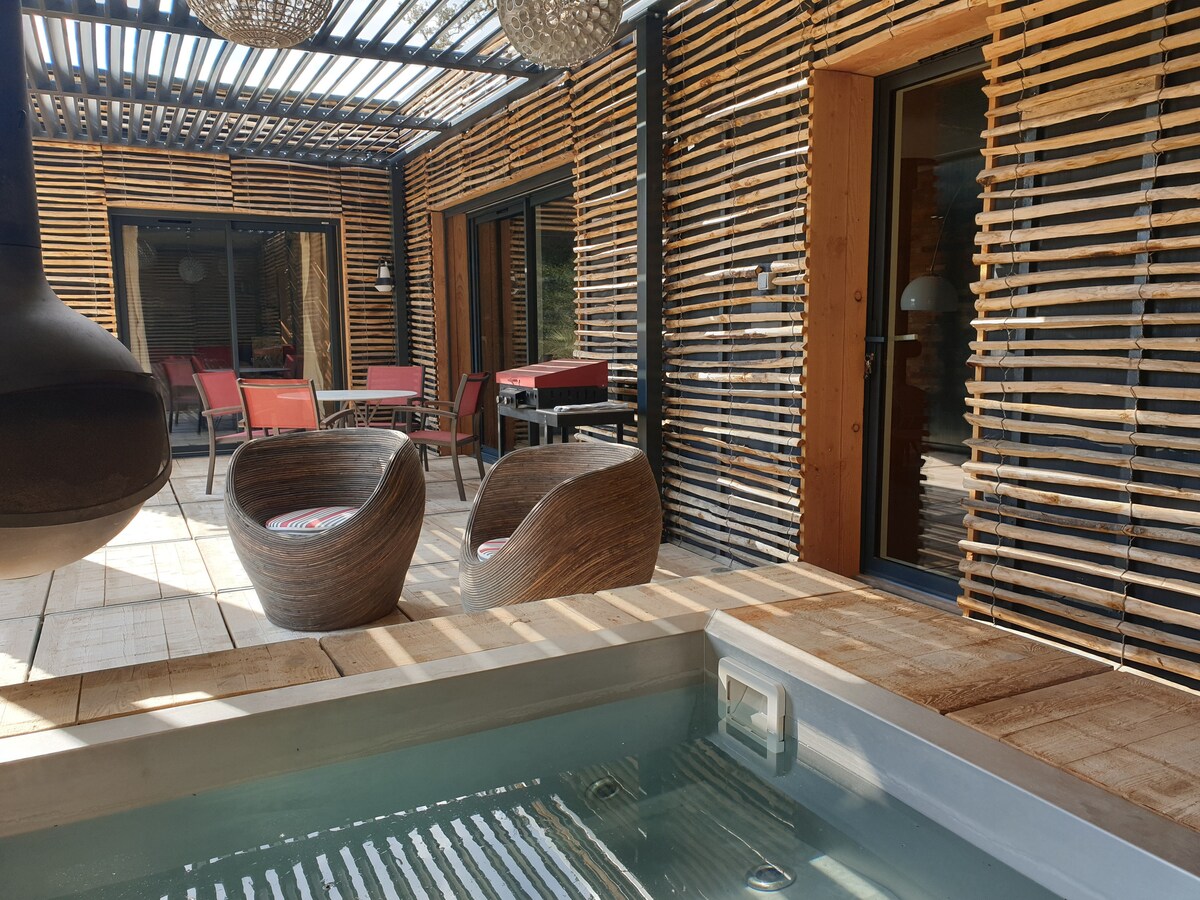 Atypisk hus med fladt tag og naturklædning, der passer perfekt ind i omgivelserne. På en grund på 1200 m2 med oliventræer og xerofytter, kan du nyde roen i det mediterrane landskab, væk fra alles øjne. En træterrasse, et jacuzzi i rustfrit stål og en bålplads venter på dig, så du kan nyde uforglemmelige øjeblikke med din partner!
