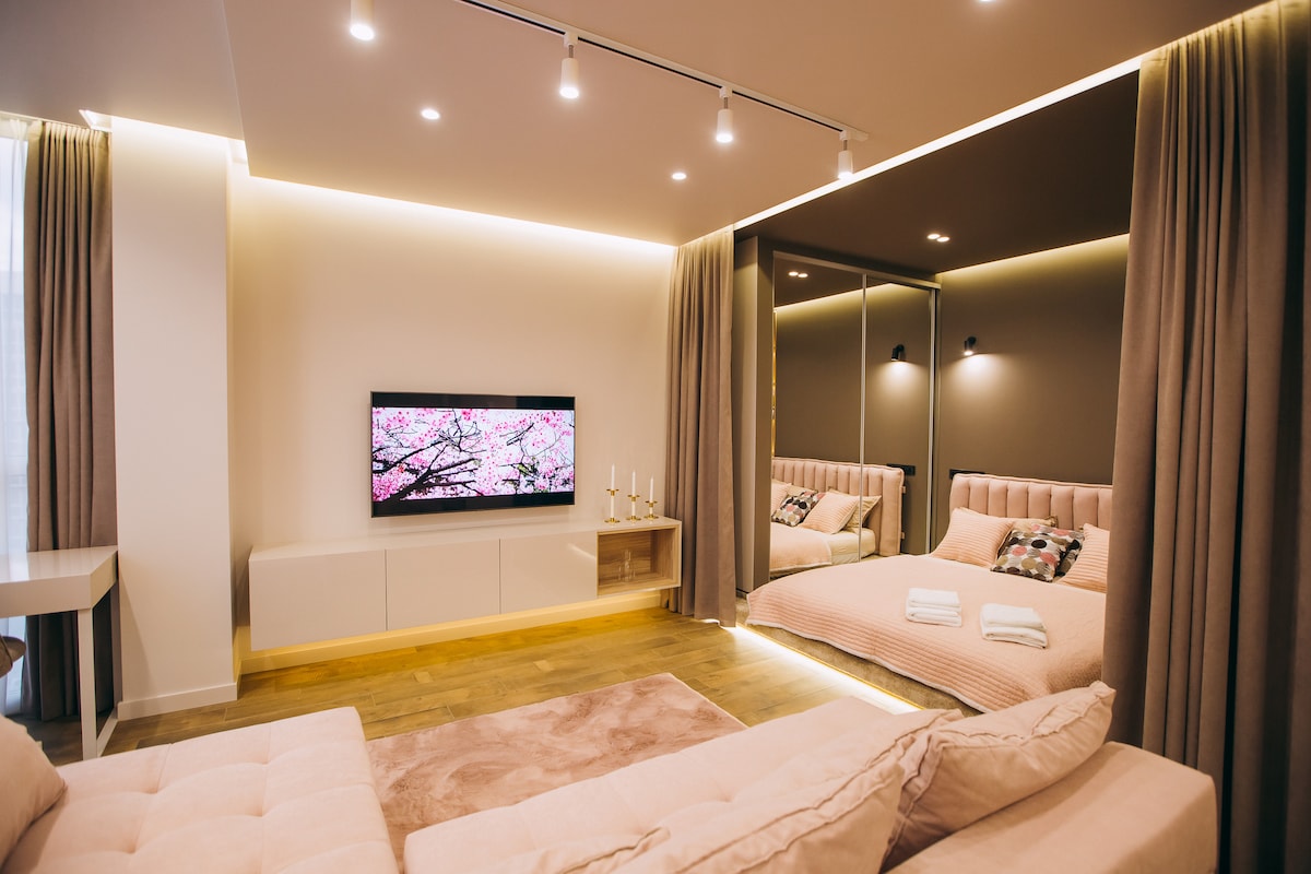 Lejligheden ligger i et historisk hus fra den østrig-ungarske æra, lige på gågaden Kobylyanska – den mest berømte og smukkeste i Tjernivtsi. Indgang gennem en velholdt gård med smedejernsporte. Indtjekning uden vært – med en sikkerhedsboks med en kode, ingen ventetid. Interiøret er indrettet i en klassisk stil med moderne elementer: Højt til loftet, dekorative paneler, varme nuancer og elegant belysning skaber en atmosfære af komfort og harmoni.