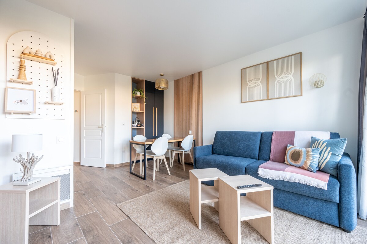 Elegant lejlighed, renoveret med kvalitetsmaterialer, ideelt beliggende i Val d'Europe, kun få minutter fra Disneyland. Komfortabelt soveværelse, raffineret stue med sovesofa, moderne udstyret køkken og designerbadeværelse. Stille og sikker bolig, vaskeri på stedet, valgfri parkering. Komfort, stil og perfekt beliggenhed kombineret.
