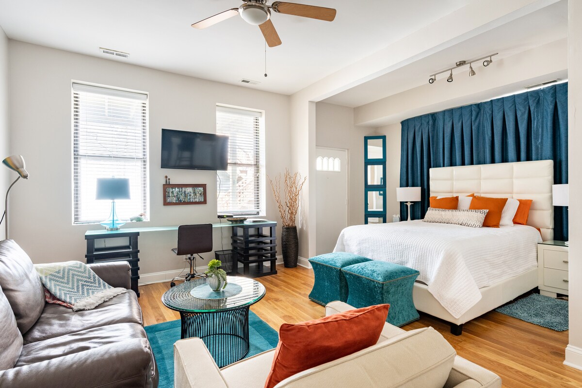 Ren! Privat! Studio beliggende i den populære Ukrainian Village. Denne rolige enhed ligger i en charmerende victoriansk hytte i lyserød mursten fra det 19. århundrede. Det er et godt fristed fra arbejde eller fritid, når du besøger Chicago. Denne indbydende bolig har moderne faciliteter, stilfuld indretning med unikke kunstværker, højt til loftet og en indbydende farvepalet. Hermitage House Studio er et perfekt hjem væk fra hjemmet med vaskemaskine, kabel-tv med On Demand og en grøn baggårdsterrasse, der er perfekt til at drikke din morgenkaffe eller te. Har du brug for en 2. bolig i samme bygning? Se airbnb.com/h/chicago-hermitage-loft2 Denne private – meget hippe atelierlejlighed - er fuldstændig renoveret og nyindrettet og er indrettet som en luksuriøs hotelsuite med alle hjemmets faciliteter!! Denne hyggelige og moderne lejlighed i første sal, der kun bruges af gæster, ligger i en gammel murstenshytte fra 1892 med en smuk udendørs baggård på en stille gade med træer. Denne rigt farvede designerindrettede bolig med kun originale kunstværker har komfort for øje. Den har masser af siddepladser, herunder en komfortabel lædersofa, et cool skrivebordsområde og en hævet bar. Trægulve i hele boligen, 9' lofter, vaskemaskine/tørretumbler, central luft og varme, hotel-lignende badeværelse med badekar og en vaskemaskine/tørretumbler i enheden. Moderne hvidt køkken har granit bordplader, kvarts vask, gas komfur-ovn, opvaskemaskine, affaldskværn, mikrobølgeovn. Køkkenet har mange sjove gadgets som fransk press kaffemaskine, elektrisk tekande og meget mere. Alt er tilgængeligt for dig. Den høje disk med barstole adskiller køkkenet fra stuen/soveområdet. Det afslappende soveværelse har plads til 2 personer med en queen-size Serta-madras, god belysning, smukke middelhavsblå gardiner og opbevaringsborde fyldt med ekstra tæpper. En fuld luftmadras kan rumme en tredje person, hvis det er nødvendigt. Der er et tilpasset skabsystem med god opbevaring til personlige ting, sko og foldet tøj. Perfekt til et par eller en Airbnb-erhvervsbruger! Fladskærms-tv med kabel- og filmkanaler Hurtig wi-fi Denne enhed ligger på den stille første sal bag i denne bygning. Den bageste terrasse på første sal er din! Det øverste dæk er privat. Denne enhed har digitale låse. Du kan vælge din egen kode før indtjekning. Jeg er let tilgængelig, men respekterer dit privatliv, medmindre du har brug for mig. Jeg bor i bygningen (nogle gange uden for byen), men er altid tilgængelig via telefon eller internet, hvis der er brug for noget eller andet, men stedet er dit til at nyde! Beliggende kun få skridt fra den travle Division Street, har dette nabolag det hele uden byens besvær. I gåafstand er der restauranter med køkkener fra hele verden samt komfortmad. Nattelivsmuligheder, herunder livemusik og sportssteder. Der er boutique-shopping, kunstgallerier, et lokalt fitnesscenter og endda en mini Target. Denne hyggelige lejlighed ligger en kort gåtur fra Division St. Blue-Line tog, der bringer dig til centrum eller til O'hare Lufthavn på få minutter. Kun to blokke til Division Blue-linjen, der løber fra O'Hare og centrum ved krydset Division/Ashland/Milwaukee Dette er et godt kvarter at gå i, men det er let tilgængeligt for mange busser, taxaer, tog og endda den nye delte Divvy cykelstation kun en blok fra atelieret. Hvis du vælger at køre, er der zoneopdelte parkeringstilladelser til rådighed - 1 om dagen. Jeg vil med glæde give vejledning til seværdigheder, nabolag, god mad, dagligvarer, kaffe og natteliv