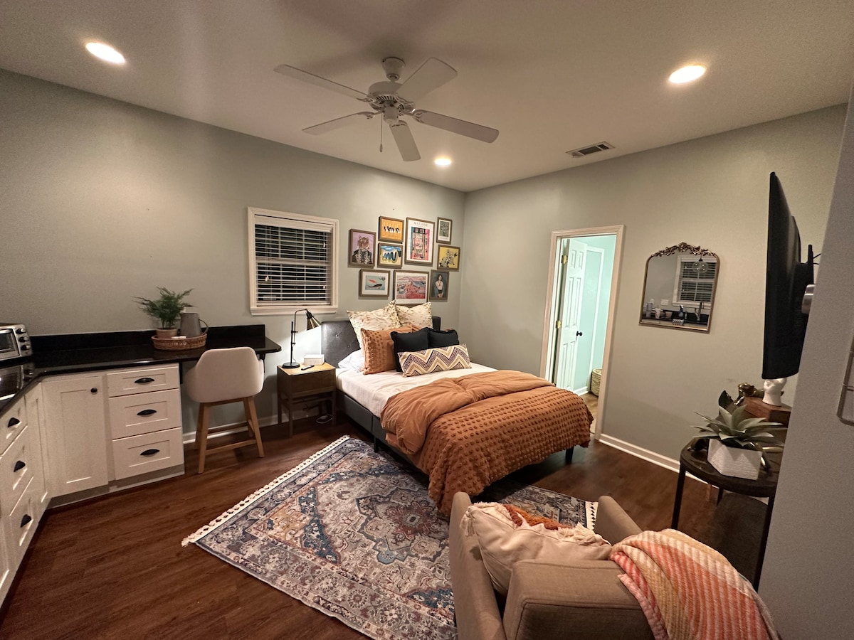 Fredeligt gæstehus med centralvarme og aircondition, tæt på alt og ingen rengøringsliste! Nyd indkørsel og gratis snacks i vores komfortable bolig fuld af vintagemøbler og bøger. Vores historiske nabolag ligger få blokke fra motorvejen, 7 minutter fra centrum, 5 minutter fra midtowns bedste restauranter og butikker og 12 minutter fra Graceland og lufthavnen. Udforsk Memphis, og hvil dig i vores charmerende hytte! En ekstra seng i fuld størrelse er tilgængelig efter anmodning.
