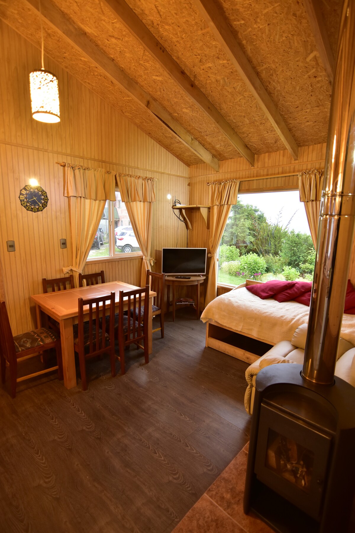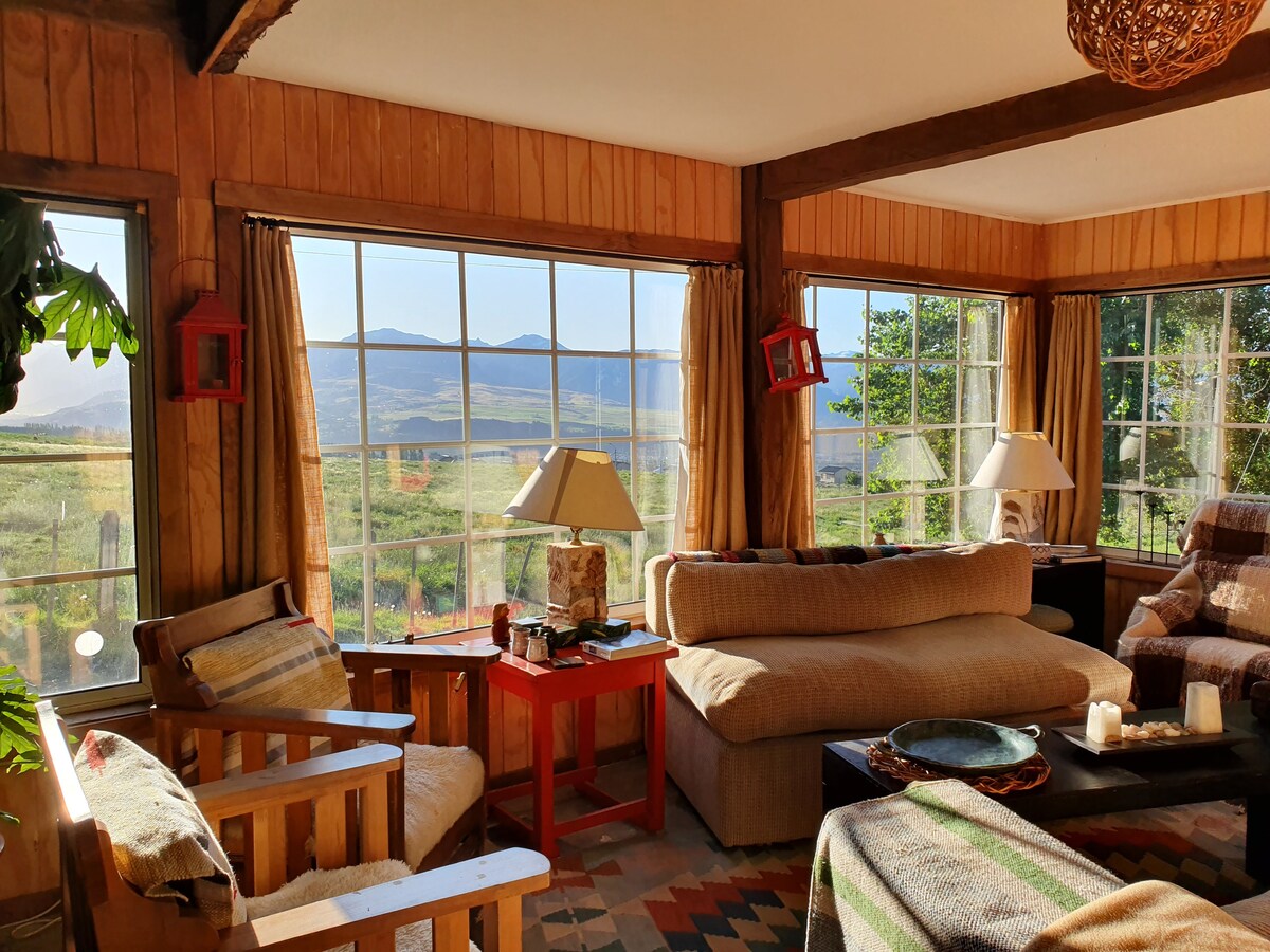 Hyggelig hytte til 5 personer ti kilometer vest for Ancud, på en bakke i det smukkeste område af Chiloé. Komfort, liv på landet og smuk udsigt. Meget hyggelig på grund af sin indretning, byggekvalitet, brændeopvarmning, Smart TV med Netflix, DirectTV, højhastigheds WiFi-dækning i hele hytten. Fremragende brusere med varmt vand, komfortable senge, fuldt udstyret køkken. Grunden har frugtplantager og husdyr. Anbefales til dem, der kører bil.