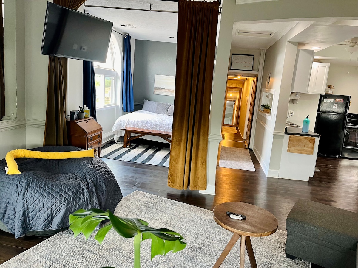 This unique place has a style all its own in a perfect tiny space. Snuggle into a perfect getaway or extended stay. Located in downtown Portsmouth within walking distance to Marting’s Event, Vern Riffe Performing Arts Center, Ohio River, Historic Boneyfiddle District with many antique shops and restaurants. Great place to jump on your bike and travel around. Wonderful things to do and see.