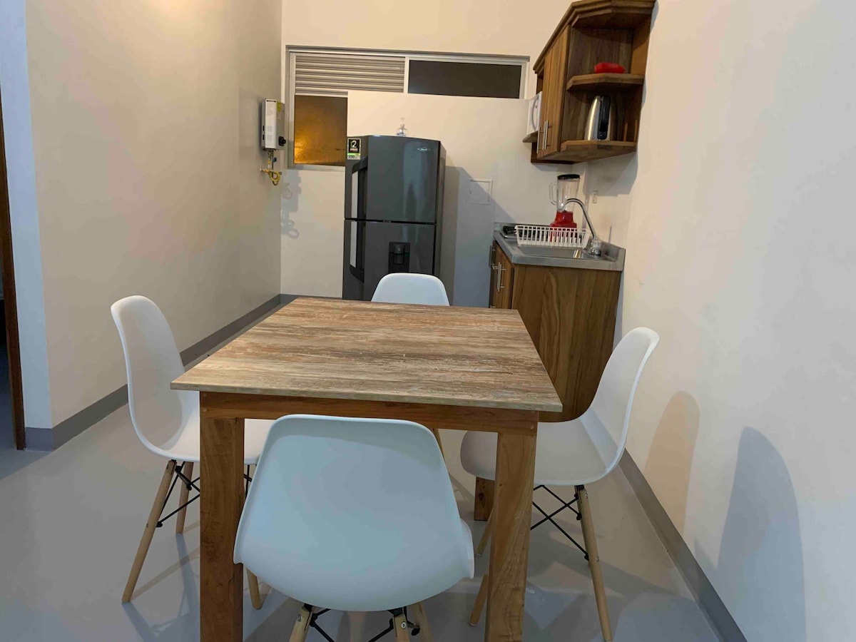 Apartamento completo y nuevo a su disposición, tranquilo, fresco, frente al Gimnasio de CrossFit y a 10 minutos del centro. Cuenta con una (1) cama doble, 2 camas sencillas, cocina integral, refrigerador, lavadora, habitación principal con baño privado, habitación secundaria, sala amplia, baño social y balcón. A pleasure to welcome you!