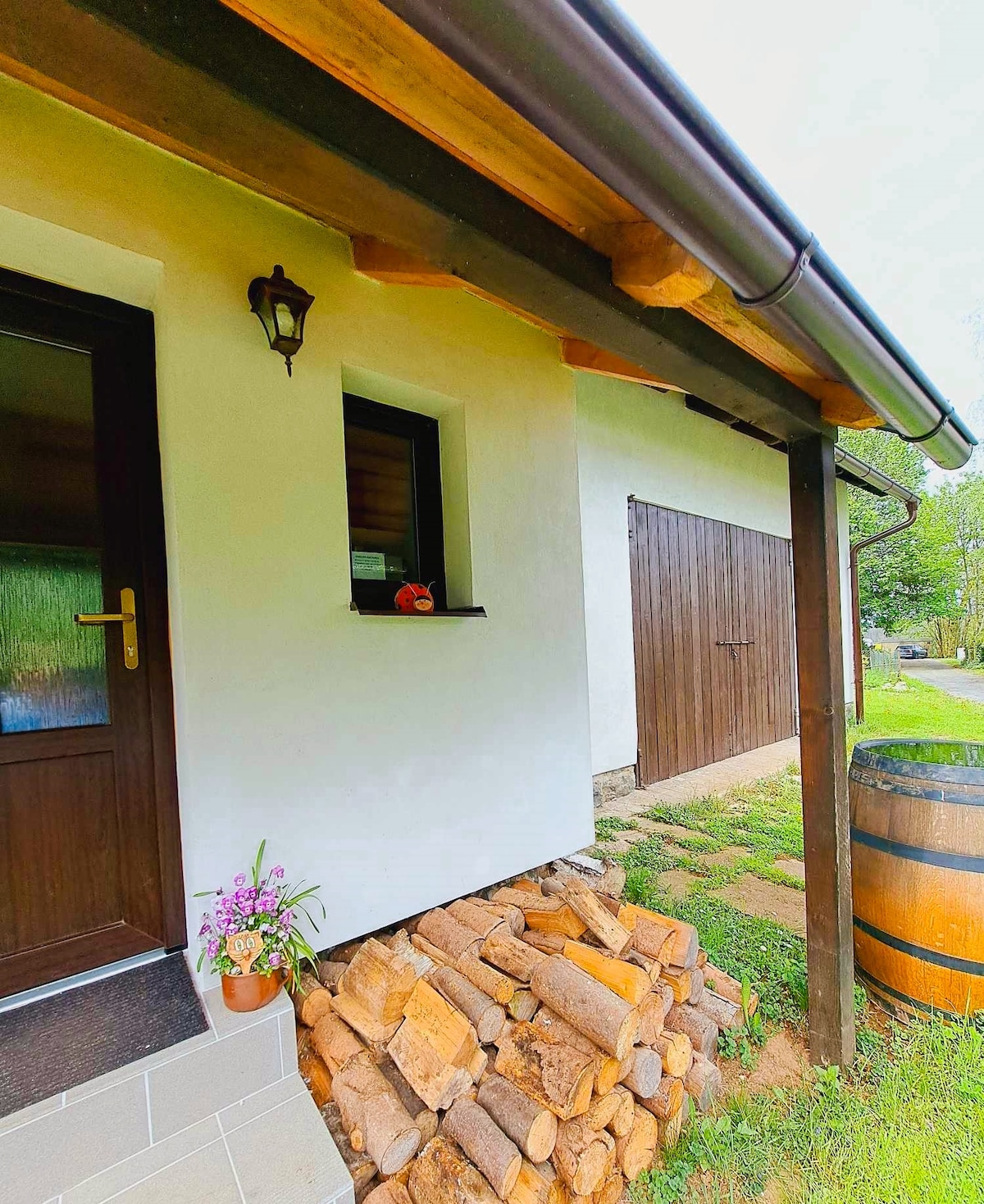 Den er af træ, den er komfortabel, den er i haven. På landet i højlandet har jeg bygget en moderne hytte, hvor min familie kan slappe af. Omgivet af havens ro med et stykke natur. Frugtplantage, damme, ubegrænset plads. Vi har gjort dette sted til et sted for fred og afslapning uden tv. Et privat spabad (har ikke en boblebadsfunktion) og sauna er tilgængelig mod et ekstra gebyr på 400 CZK og 600 for 1 opvarmning.