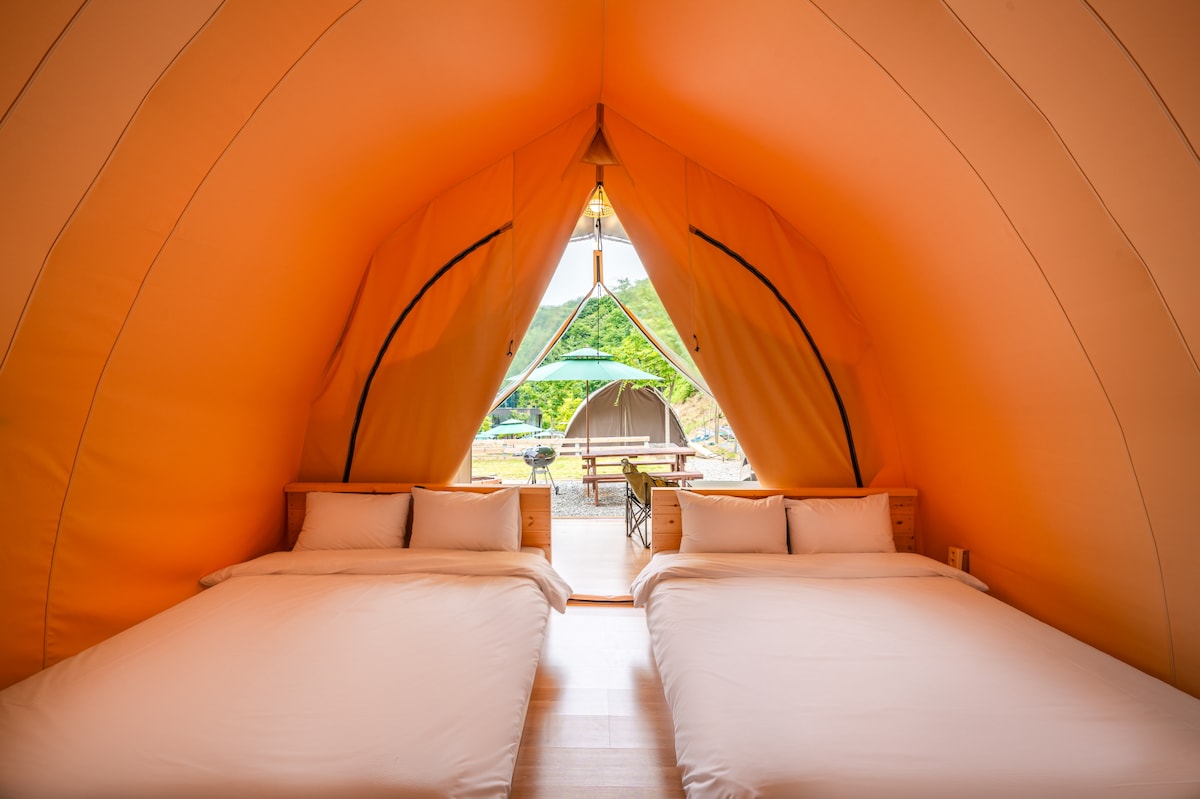 Dette er Park of Dream, et repræsentativt glampingsted i Korea. Det er en time væk fra Seongsimdang, et berømt bageri i Daejeon, og inden for 30 minutter er Muryeong Royal Tomb og Gongsanseong, Koreas kulturarv. Du kan se tilbage på koreansk historie og berømte bagerier, og lige foran er Gyeryong-bjerget, et sted, der er elsket af mange vandrere. Dette er Park of Dream glampingplads, et sted, hvor du fuldt ud kan opleve Koreas natur.