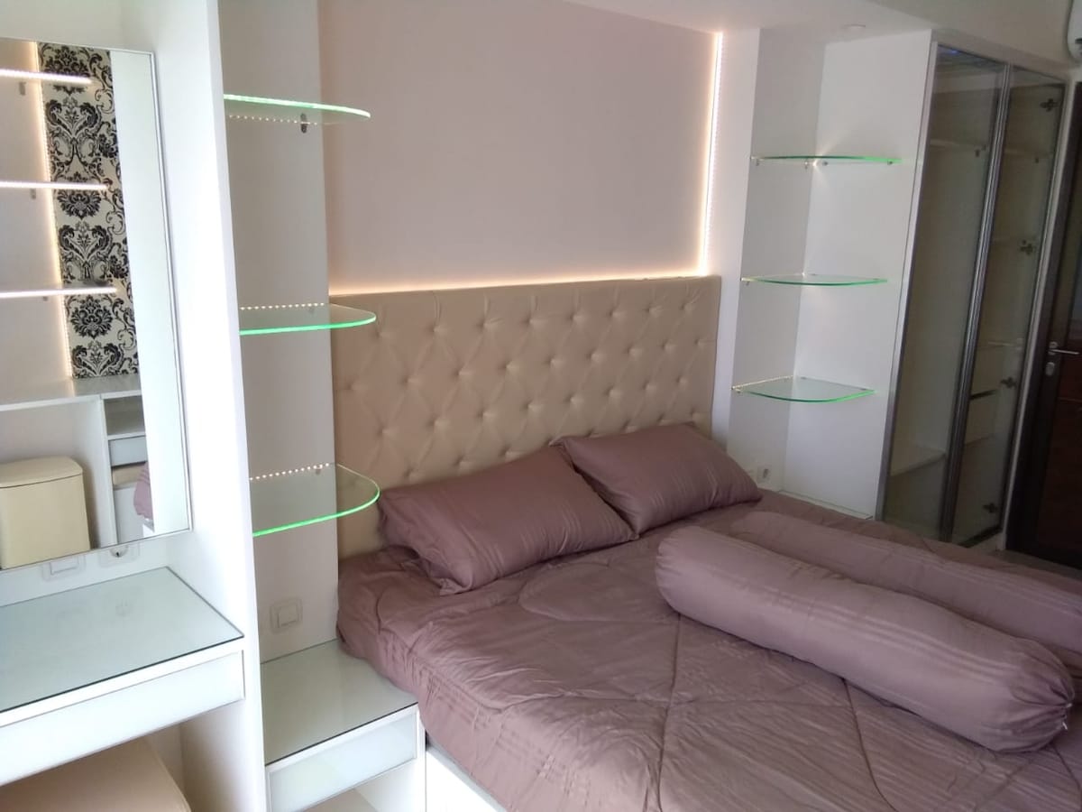 Det er en helt ny lejlighed med moderne og hyggeligt interiør. Beliggenheden er ikke langt væk fra Pasteur Highway,ITB Campus, Gedung Sate og Bandung Indah Plaza. Stor swimmingpool, hvor man kan se fra boligen, og betalt parkering er tilgængelig i kælderen for dem, der kører. Der er mange madbod, vaskeri, dagligvarebutik og også på facaden er der mange butikker omkring bygningen. Du vil ikke fortryde, hvis du vælger denne bolig som dit ophold.