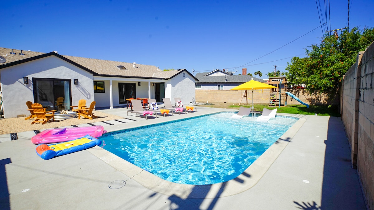 Art-filled retreat with unique artifacts, a lush garden with vibrant plants and vegetation, small pond, private pool & spa, firepit, and outdoor kitchen. Relax in a quiet cul-de-sac with two shaded patios, modern entertainment including streaming TVs, surround sound, a small pool table, and an Xbox. Ideal for families, friends, couples, or business travelers seeking comfort, privacy, and a memorable Southern California stay near Disneyland and major attractions.