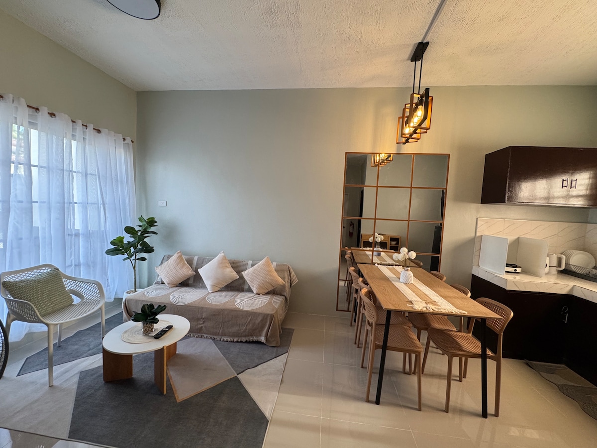 Velkommen til vores charmerende, hyggelige sted, hvor du kan slappe af og nyde en fredelig smuttur. Denne smukt designede bolig er fyldt med bløde, naturlige toner og håndplukket indretning, der skaber en indbydende og fredfyldt atmosfære. Stuen i åbent plan er perfekt til afslapning med bløde siddepladser, varm belysning og et strejf af moderne stil, der får dig til at føle dig hjemme. Dette rum tilbyder den perfekte blanding af komfort og æstetisk skønhed. Et ægte hjem væk fra hjemmet.