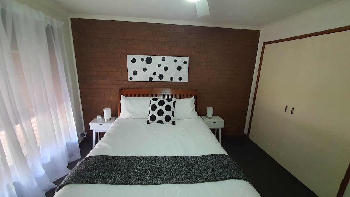 Velkommen til Wodonga! Vores lejlighed ligger kun 2 minutter fra motorvejen og en blok fra hovedgaden med restauranter, butikker og underholdning inden for få minutters gang. Belvoir Park er lige rundt om hjørnet, som har en sø, Island Rotunda med grill, en stor legeplads og 1 km vandresti omkring søen med træningsudstyr. Vores lejlighed er børnevenlig med en barneseng og en høj stol. Der tilbydes morgenmad den første dag, som omfatter æg, korn, toast og kaffe.