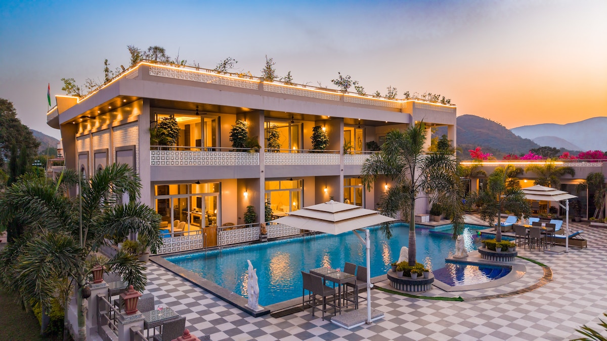 Nestled in the Aravalli Hills near Fatehsagar Lake, Mountain Creek Retreat is a luxurious 7-bedroom estate designed for group getaways and celebrations. The retreat features spacious suites with private patios or balconies, elegant living and dining areas, a bar lounge, and two commercial kitchens. Guests can unwind at the 1,500 sq. ft. swimming pool, poolside gazebo bar, scenic terraces, garden picnic lawn, and recreation studio with indoor games and gym for a relaxing stay.