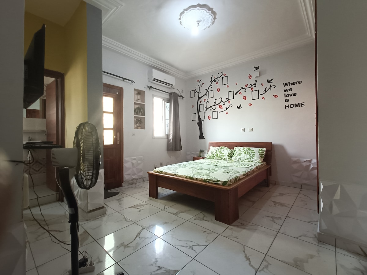 Nyd en 2-værelses lejlighed i et lavt hus, i hjertet af Vallon, det centrale kvarter i Cocody, i et roligt boligområde. Lejligheden ligger 2 minutter fra rue des jardins des Deux Plateaux Vallon og derfor tæt på alle bekvemmeligheder: Banker, restauranter, bagerier, supermarkeder. Den har ubegrænset internetforbindelse + NETFLIX + vandvarmer + vaskemaskine + Canal (standardformel) + rengøringsassistent (2 gange om ugen)