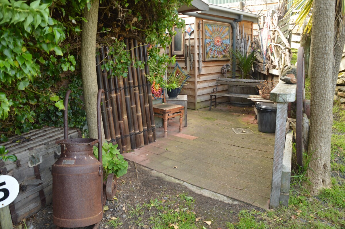 Et drømmende og hyggeligt sted, der er en sand hytte i skoven. Long Tide retreat er det mest magiske sted at slappe af, genoprette forbindelsen og få fornyet energi. Laden ligger blandt frodige, grønne åbne græsarealer og høj majestætisk regnskov et par hundrede meter over havets overflade, hvilket giver virkelig episk havudsigt. Der er en rolig energi fra de åbne områder og den omkringliggende skov. Et stort område af land, hav og himmel smelter sammen med de jordnære og varme toner i det hyggelige hus i ladestil.