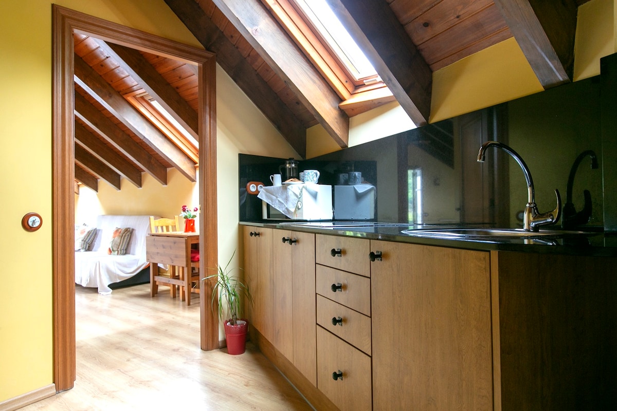 Duplex lejlighed (højre) Gratis WIFI. To soveværelser (maks. 5 personer), komplet badeværelse, stue med fuldt udstyret tekøkken. Sengetøj, Norden og håndklæder er inkluderet. SPEKTAKULÆR UDSIGT. All apartments in which the house is divided, have free access to the private Terrace-Mirador of the accommodation. Parker foran huset. 3 km fra Vielha og 15 km fra Baqueira. Vi har to meget lignende lejligheder (Dreta i Esquerra), mellem de to har plads til 10 personer.